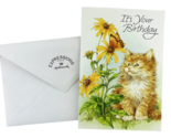Features an orange kitten with green eyes, staring up at a butterfly perched on a yellow flower. Front of card has the words It's Your Birthday and the inside sentiment is May the nicest things that life can hold be yours today and always.