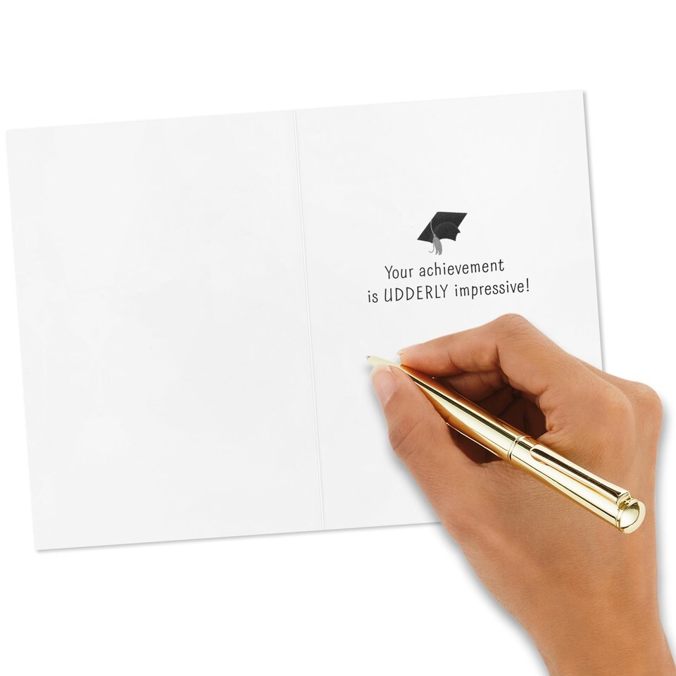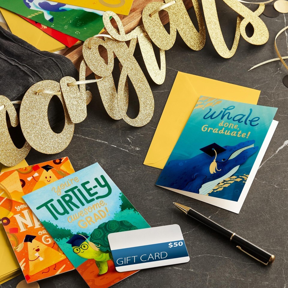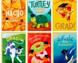 Pack of 36 graduation cards includes 6 colorful designs with silly puns, including "You are NACHO ordinary grad," "WHALE done, Graduate," "You're TURTLE-Y awesome, Grad," and "COW-gratualtions, Grad!"