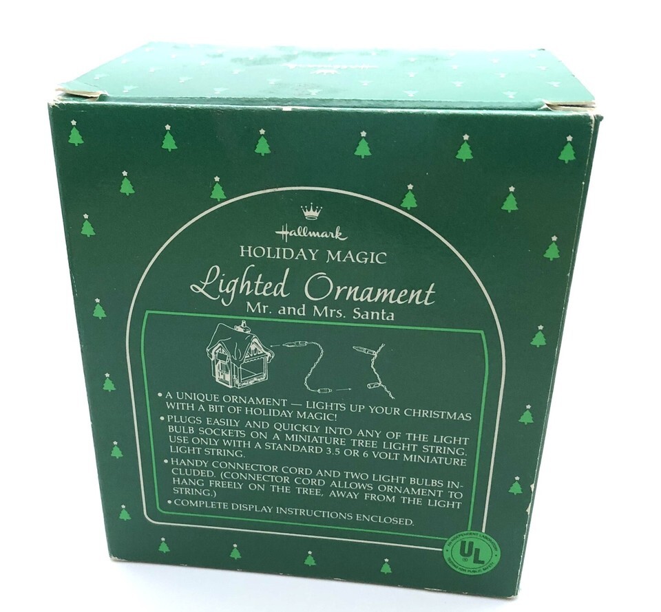 Hallmark Holiday Magic Lighted Christmas Ornament Mr. and Mrs. Santa 1985. The ornament does not come with any lights, it has an opening in back to insert a Christmas tree light bulb in it. The ornament box may have some wear which is typical for its age, overall both are in good, clean, pre-owned condition. I do offer calculated shipping in cart when you purchase
