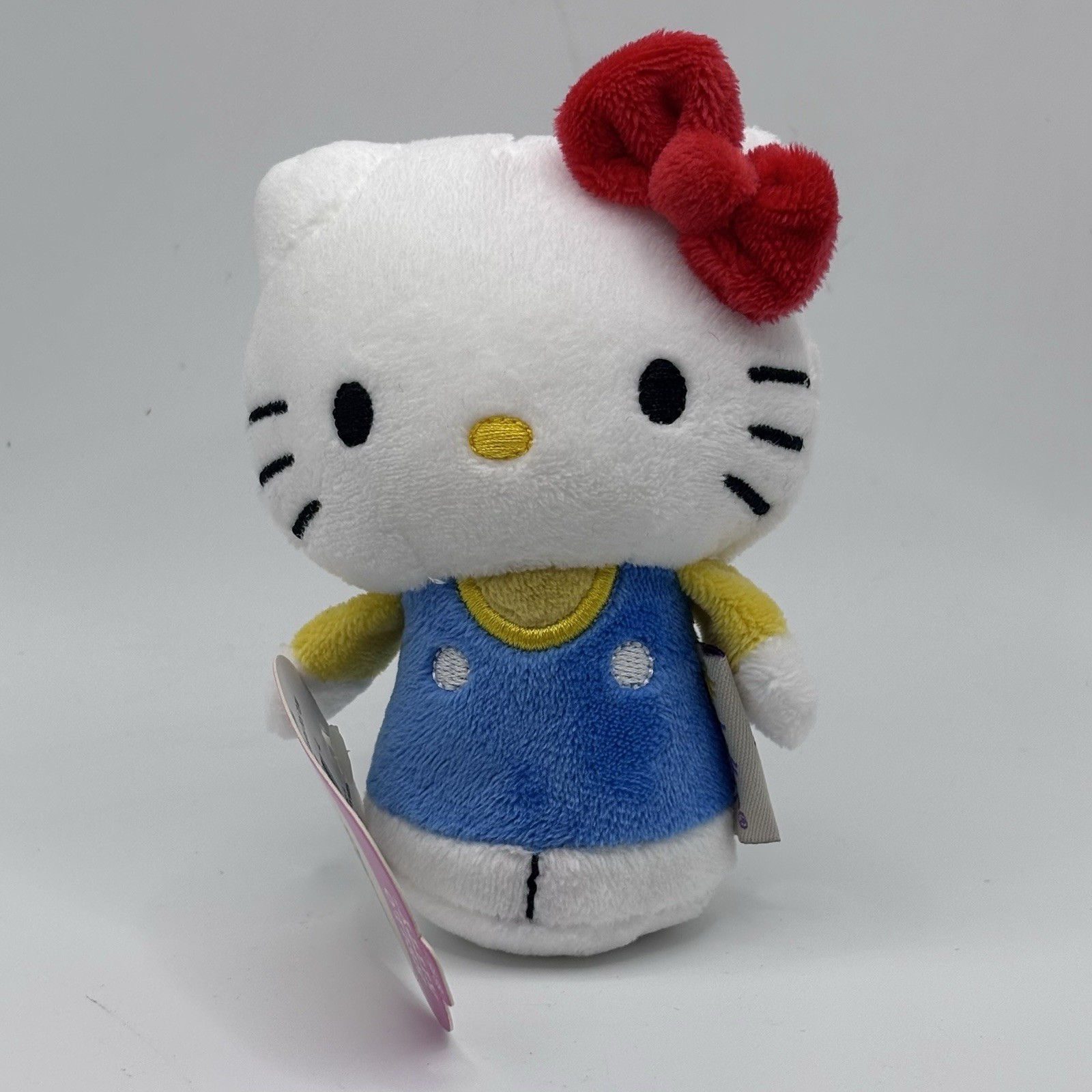 Dressed in blue overalls with a yellow shirt and featuring sweet embroidered details, this itty bittys kitty celebrates 50 years of Hello Kitty and her enduring, indelible popularity.