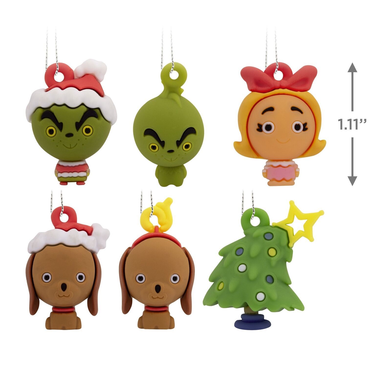 Set of 6 miniature Christmas ornaments includes Grinch, Grinch in Santa outfit, Cindy-Lou Who, Max, Max in Santa outfit and a Christmas tree.