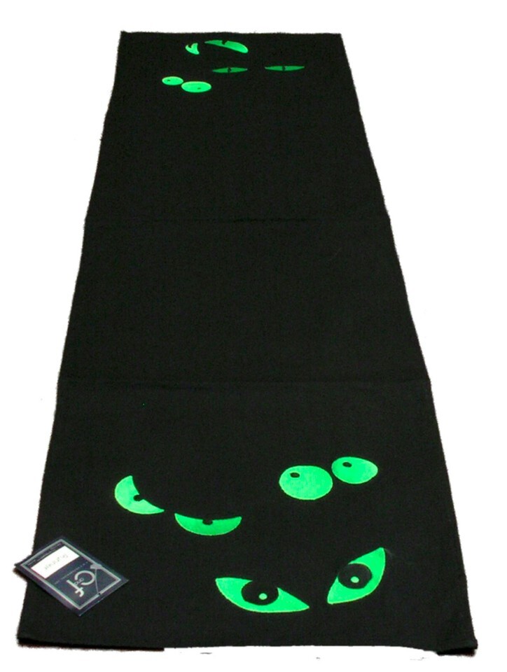 Table Runner, Spooky Bright Green Eyes Embroidered On Black. Perfect for Halloween parties or get togethers. 14 x 51 inches.