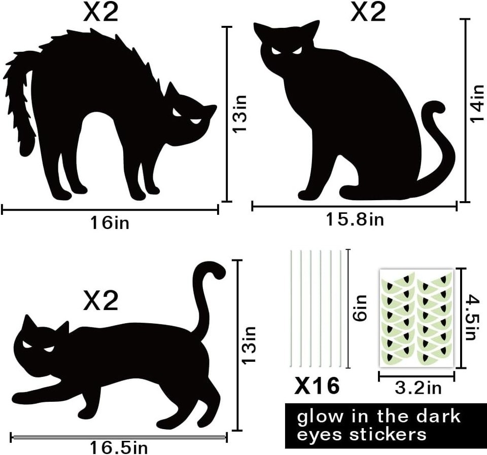 PACKAGE INCLUDES: 6ct scary black cat silhouette Halloween yard signs, 16 stakes, 24pcs glow in dark eyes stickers. Setting the creepy mood for Halloween yard.
