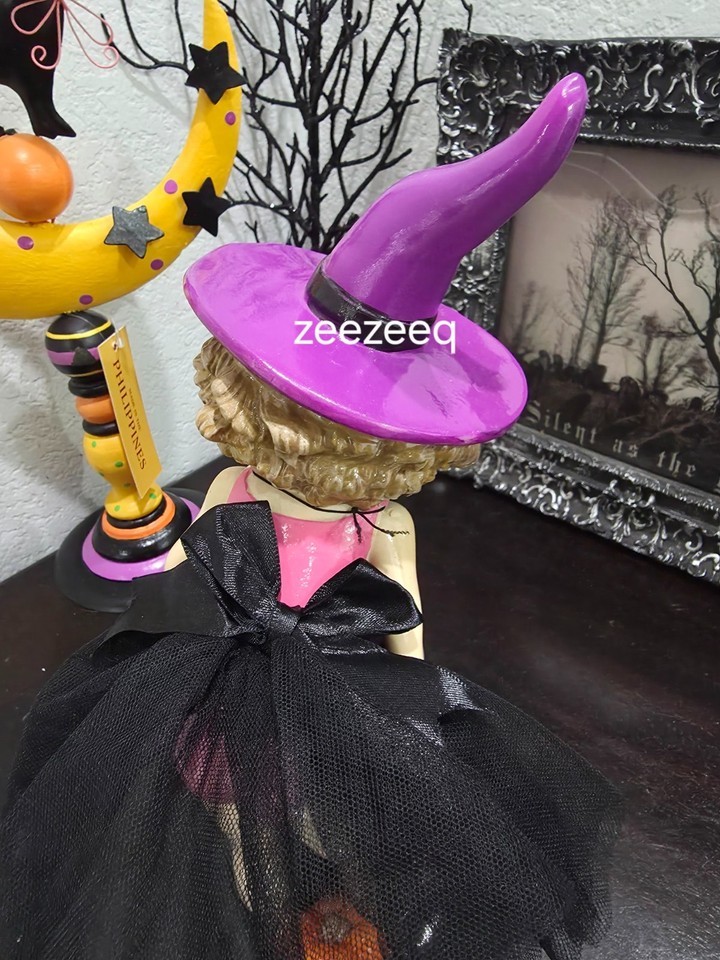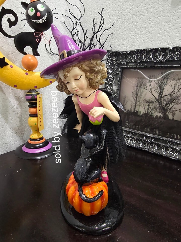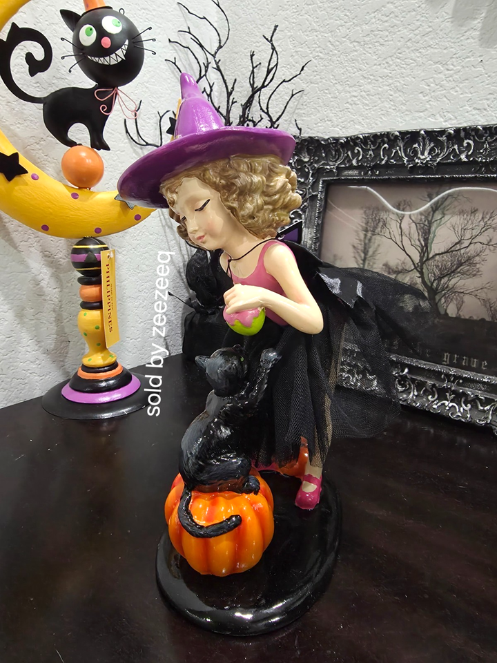 Up for sale we have this adorable witch for your Halloween decor. She is tooo cute!! She is holding a apple and showing it to her black cat. Her tutu skirt has a black bow on the back. She is dorable! She stands approx 11.5" tall. Made of resin. NEW