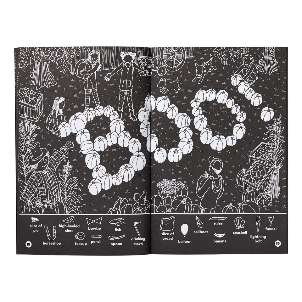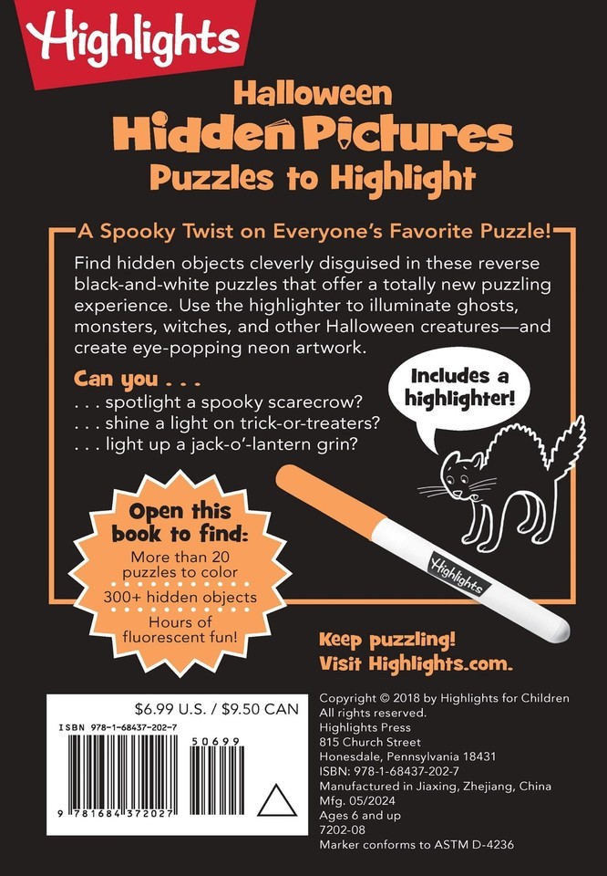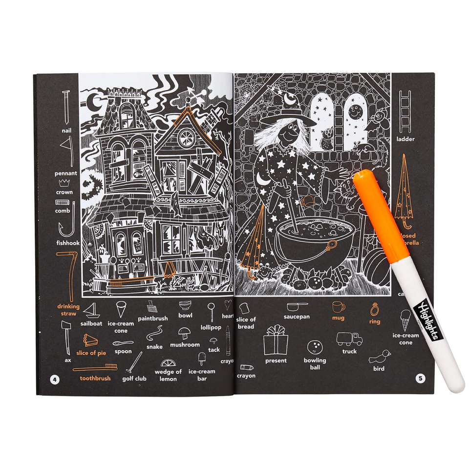 Pumpkins, scarecrows, monsters, and other spooky creatures pop out in this Halloween twist on everyone's favorite puzzle. Kids can use the included orange highlighter to create glowing neon scenes and illuminate the cleverly hidden objects in these challenging white-on-black puzzles. Illustrations. Consumable.