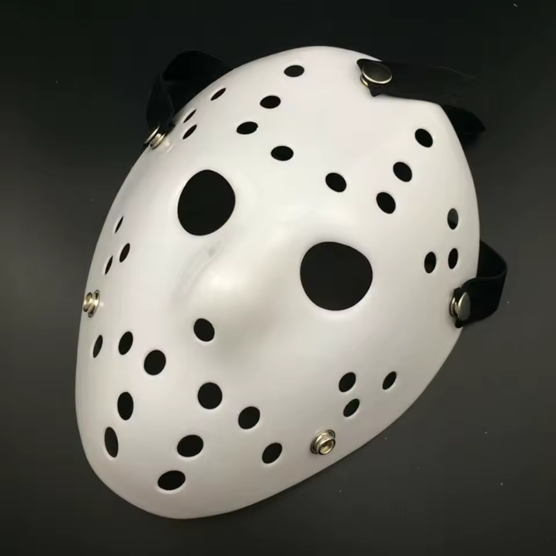 Hockey mask, white scary mask, halloween cosplay mask, horror costume mask, plastic full face mask, masquerade party mask, adult halloween prop, scary hockey cosplay, fancy dress mask, carnival costume accessory.