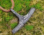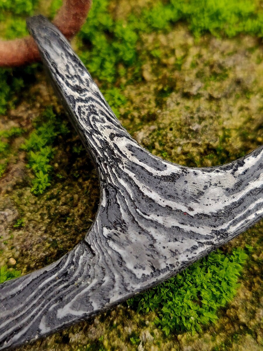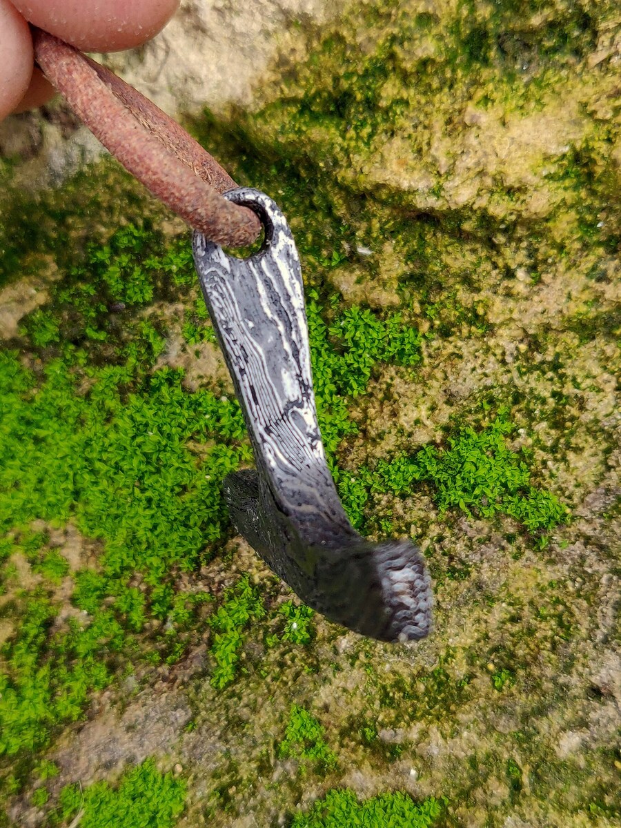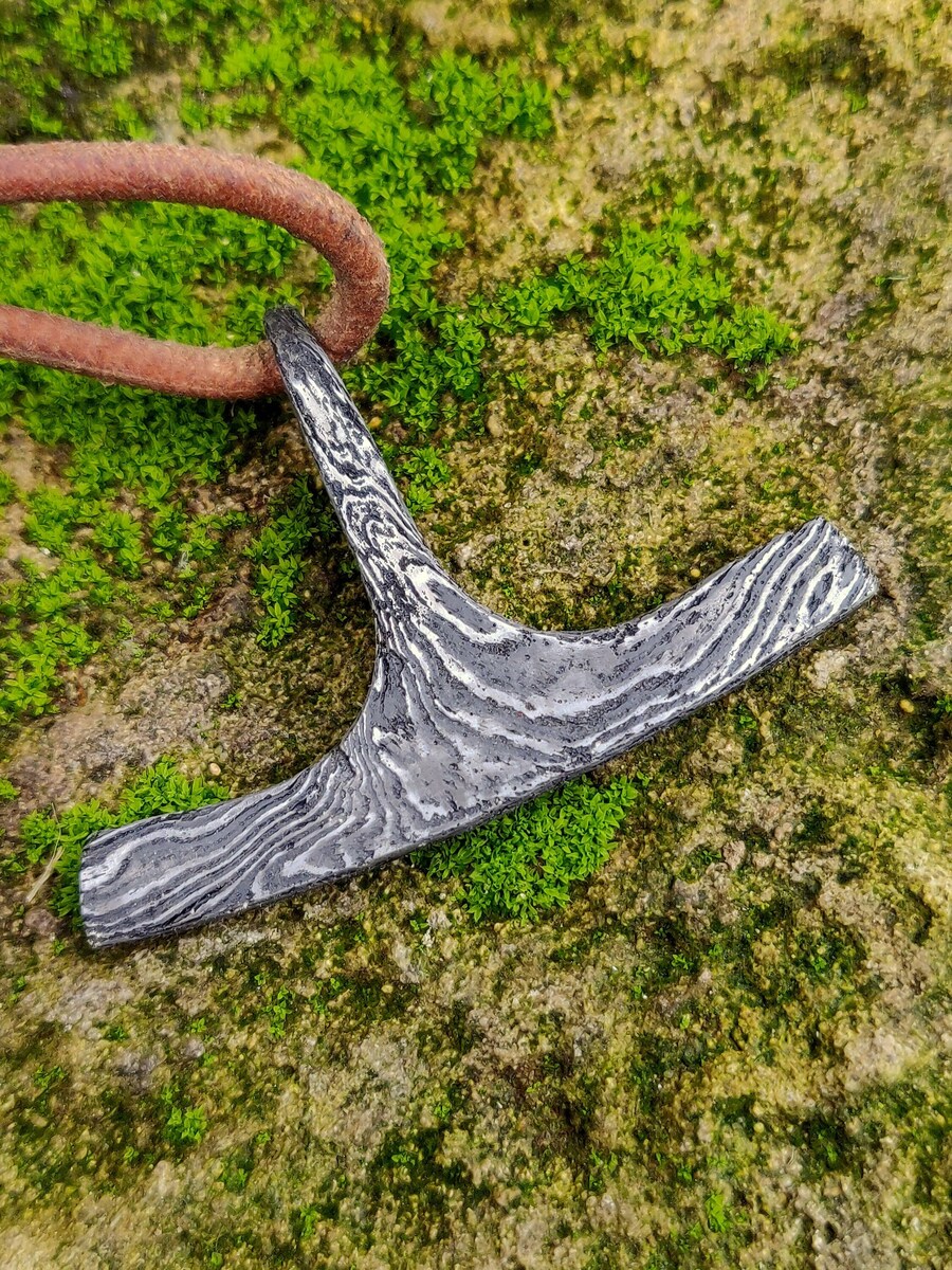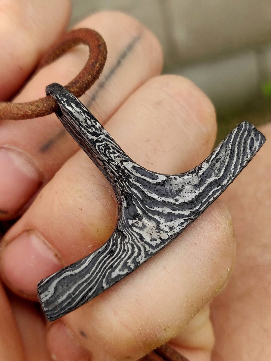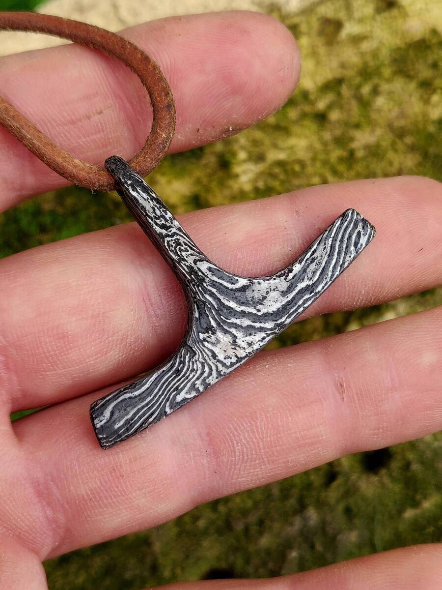 Laminated steel (many times called Damascus steel nowadays) is hand-forged by me in my little medieval inspired forge. Laminating steel is a process of stacking layers of different steel one upon another and then heat them up to bright white temperature(where the outer layers of steel start to melt) and then applying force to merge them permanently (called forge welding). The pendant is ground, sanded, and then deeply etched to bring out patterns, finished with an oil coat to prevent corrosion.