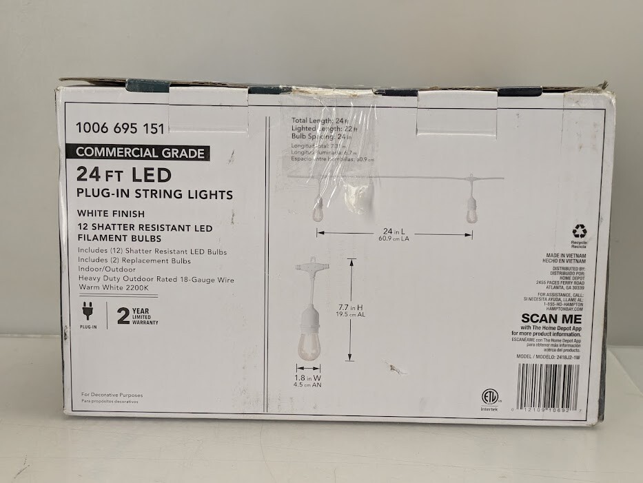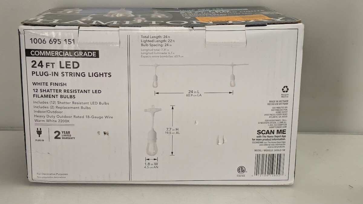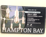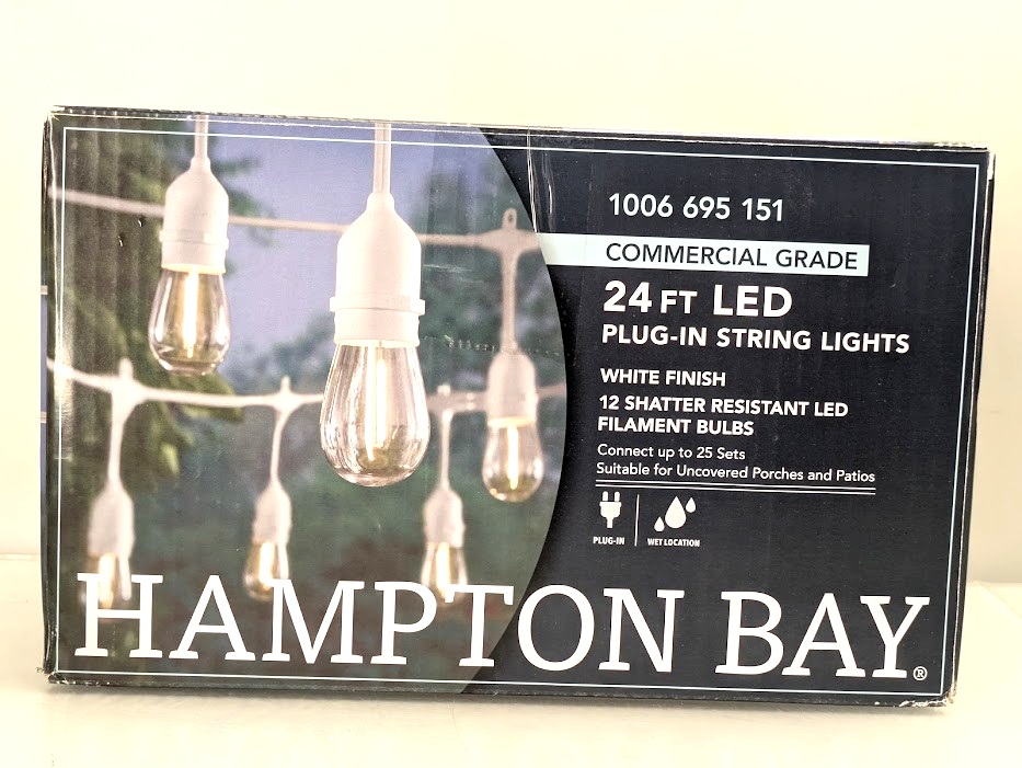 The Hampton Bay LED String Lights combine the beauty of vintage, Edison-style bulbs with the latest in cutting-edge LED technology to bring you beautiful lighting where you want it. State-of-the-art LEDs save up to $99 per year on your electric bill, versus using traditional incandescent bulbs. The soft, warm light will add a welcoming glow to any location. This light set includes 12 LED lights on a 24 ft. string and its energy-efficient design means you can link up to 600 ft. for a total of 25 strings using 1 electrical outlet. These commercial-grade lights are equipped with impact- and weather-resistant bulbs and have been designed for outdoor use, but will also add a festive atmosphere to your indoor locations. No need to worry about the hazard of broken glass with these lights as they won't break if dropped.