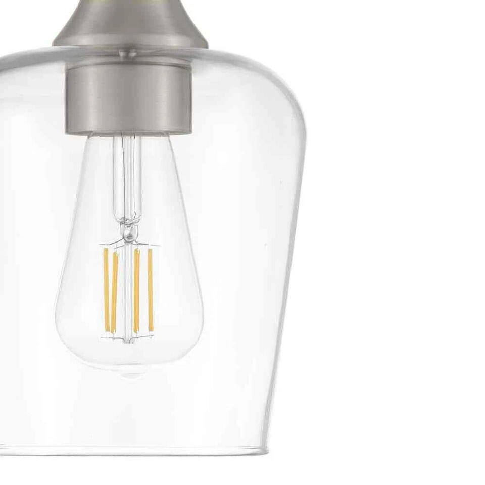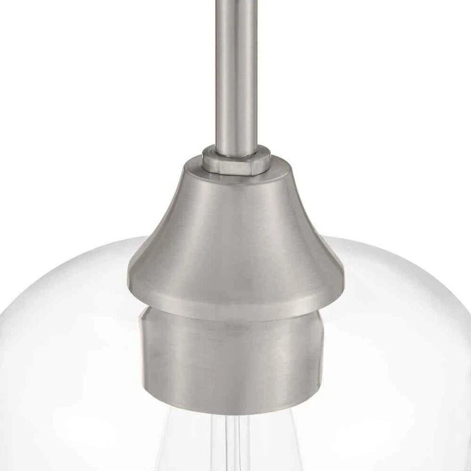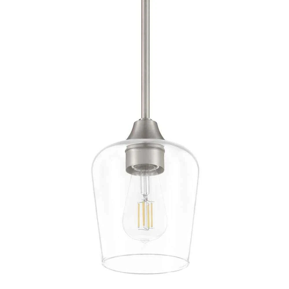 1-light brushed nickel mini pendant with clear glass shade creates a refined contemporary look, ideal to hang in pairs over a kitchen island