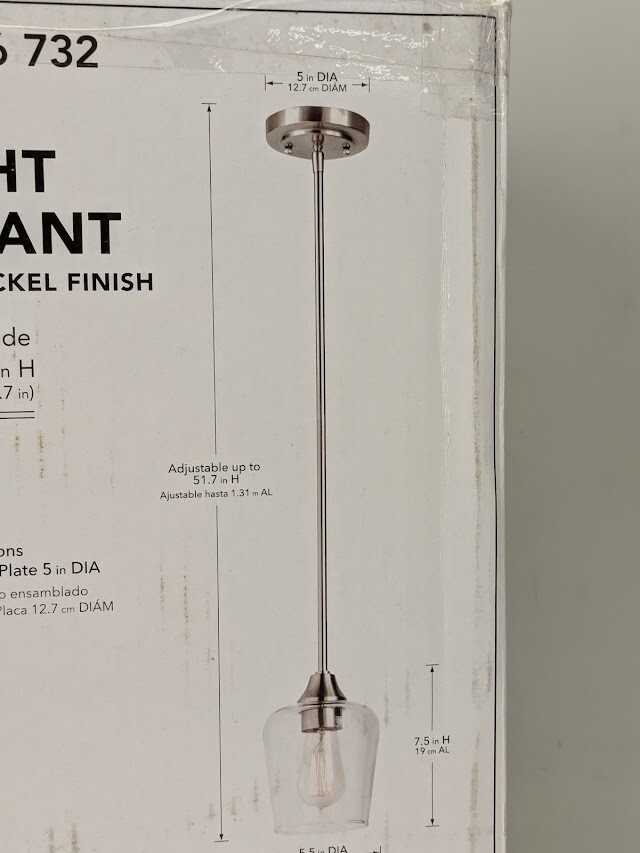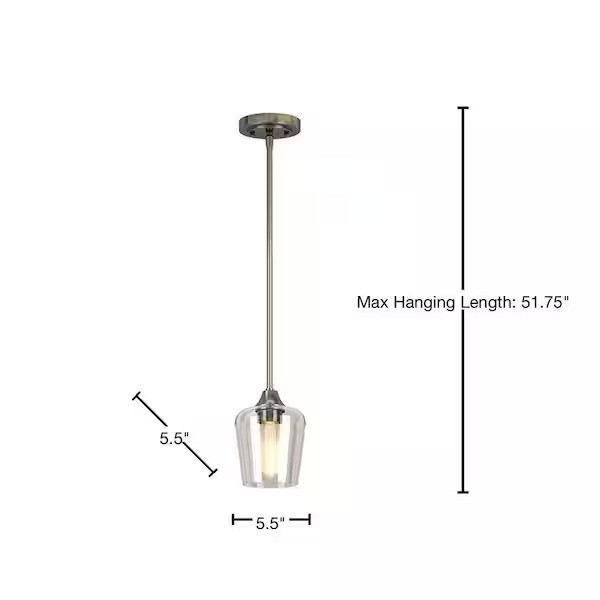 This versatile Mini Pendant Light can create ambient lighting to multiple key locations such as office, Kitchen island, bar/counter and dinning room for the next family get together. This stunning design features a burnished brushed nickel finish with clear glass shades inspired by the curved edges of a wine glass. It measures an overall 51.75 in. H from top to bottom and it uses one 60-Watt (maximum) bulb. the item has adjustable stems and is easy to install.