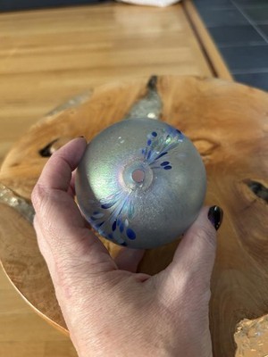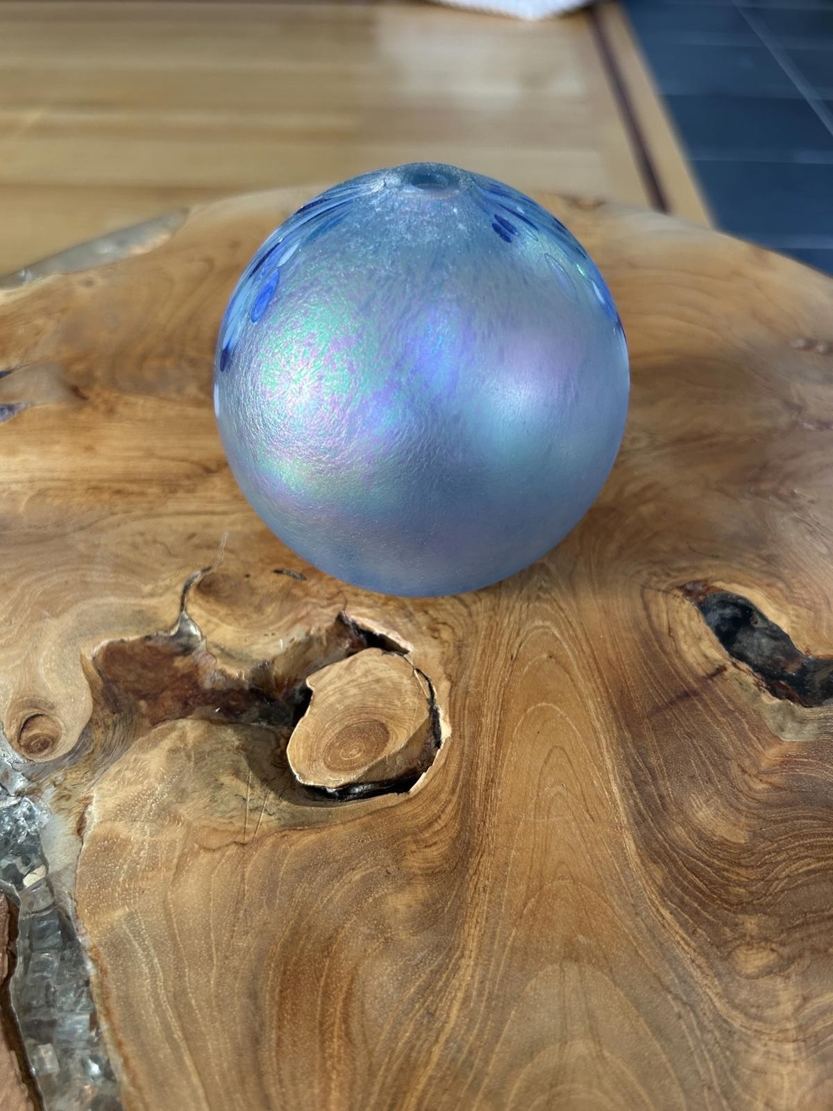 - Hand Blown Glass Art Sphere with Blue Leaf Design