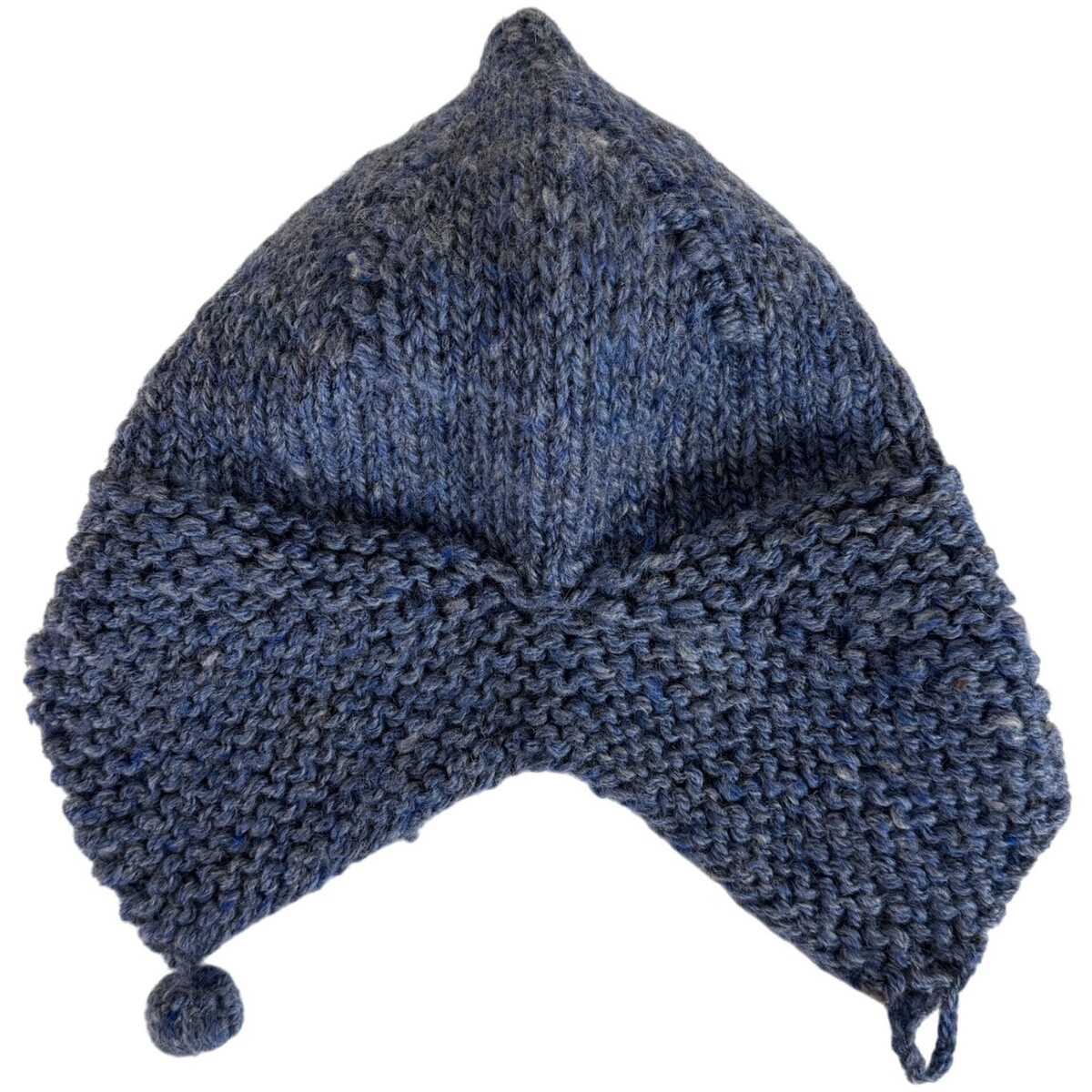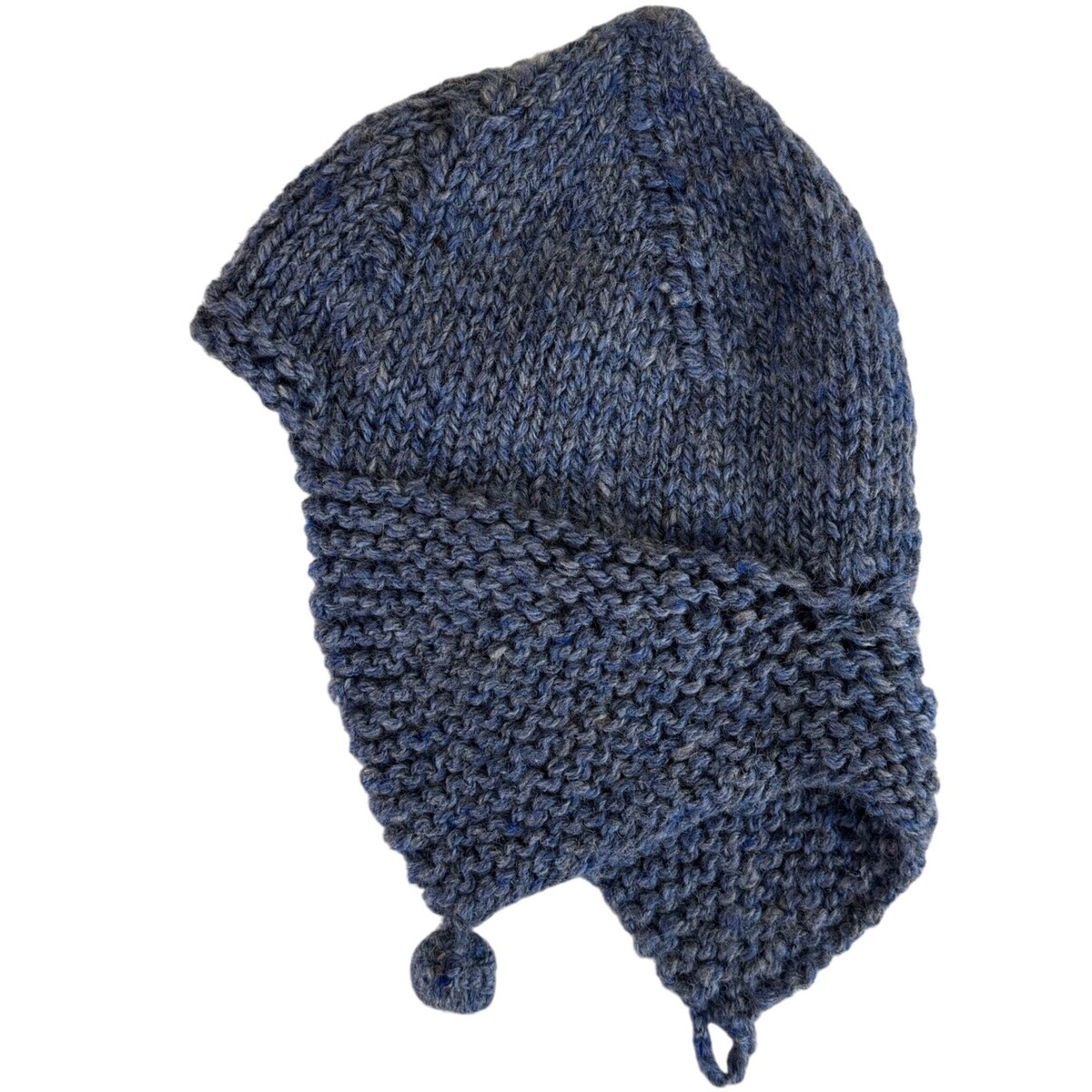Hand-knit wool earflap hat in a soft heathered blue. Cozy, chunky knit with pointed crown shaping and a functional pom-and-loop chin closure. One earflap has a knit pom; the opposite flap has a matching knit loop so the two can fasten together.