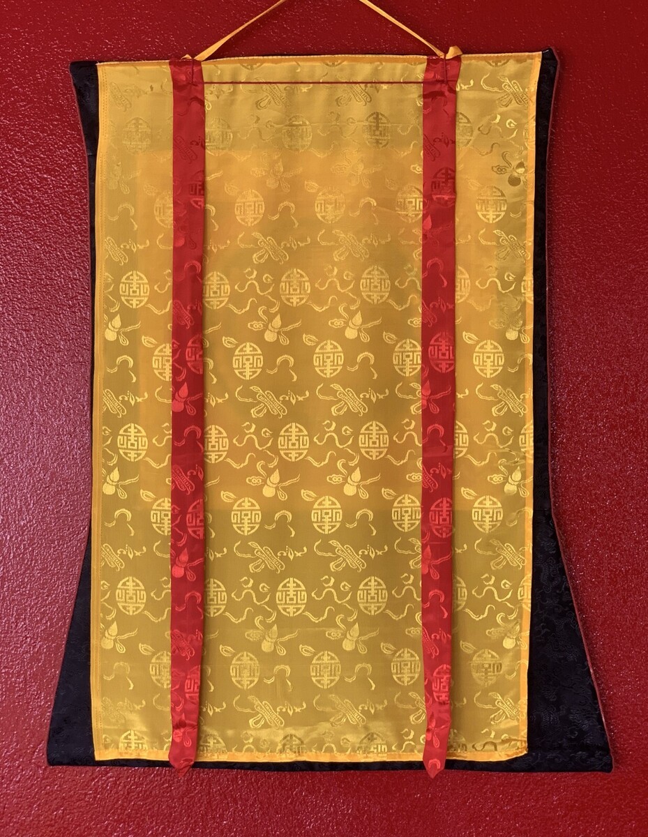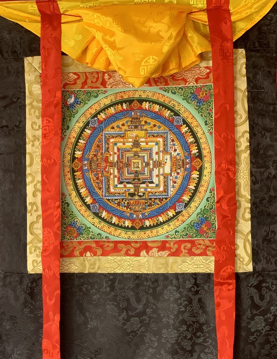 HAND-PAINTED KALACHAKRA MANDALA -THE WHEEL OF LIFE CIRCLE ORIGINAL- UNIQUE TIBETAN THANGKA PAINTING, BUDDHIST ART WITH SILK BORDER/BROCADE