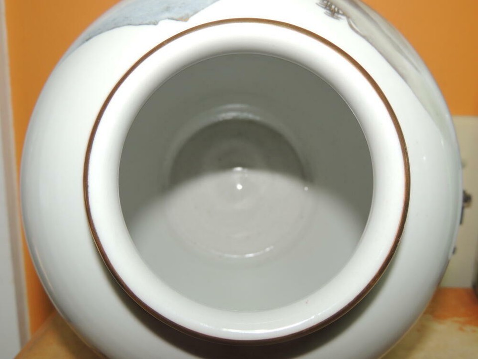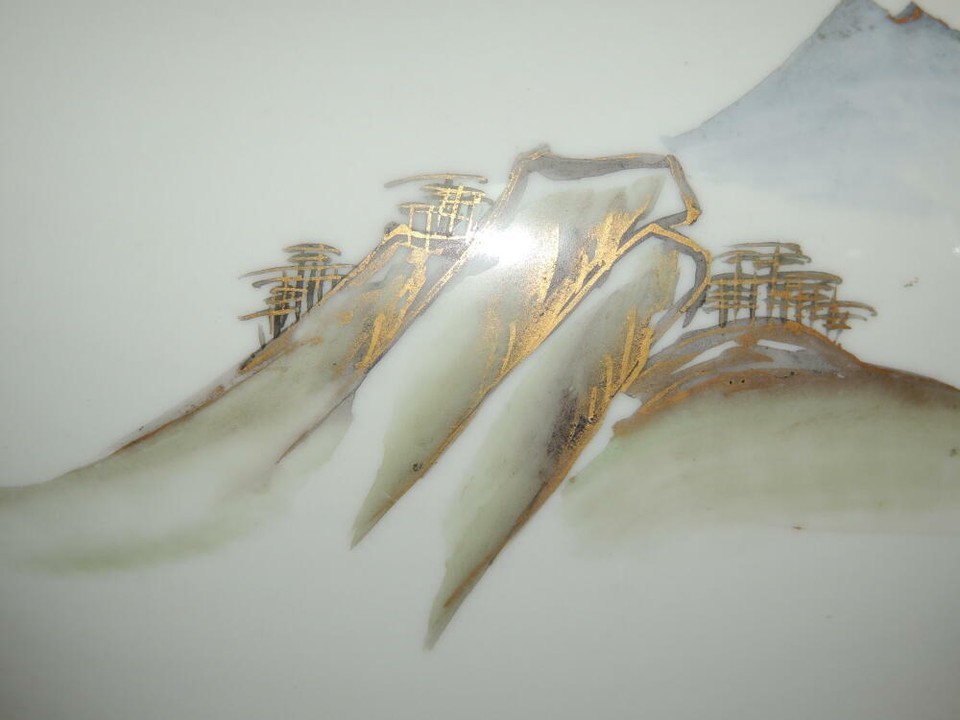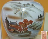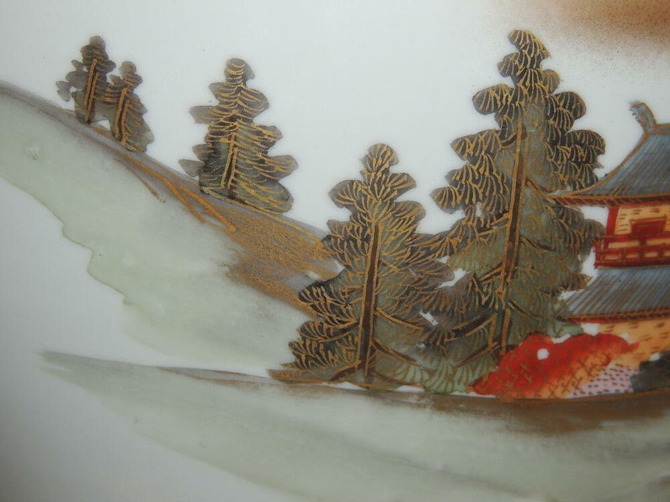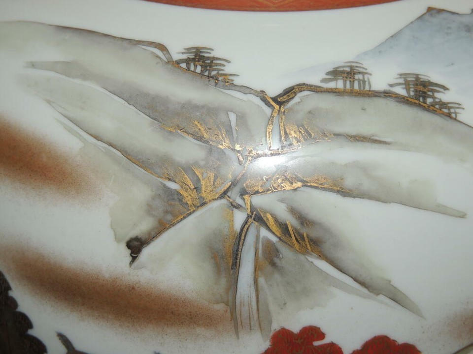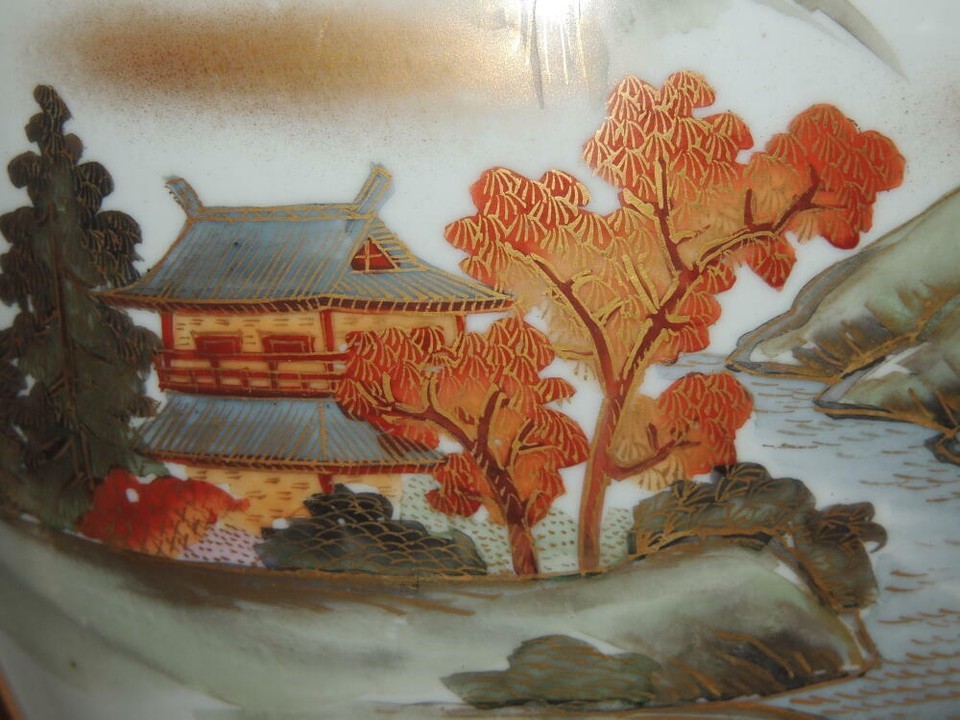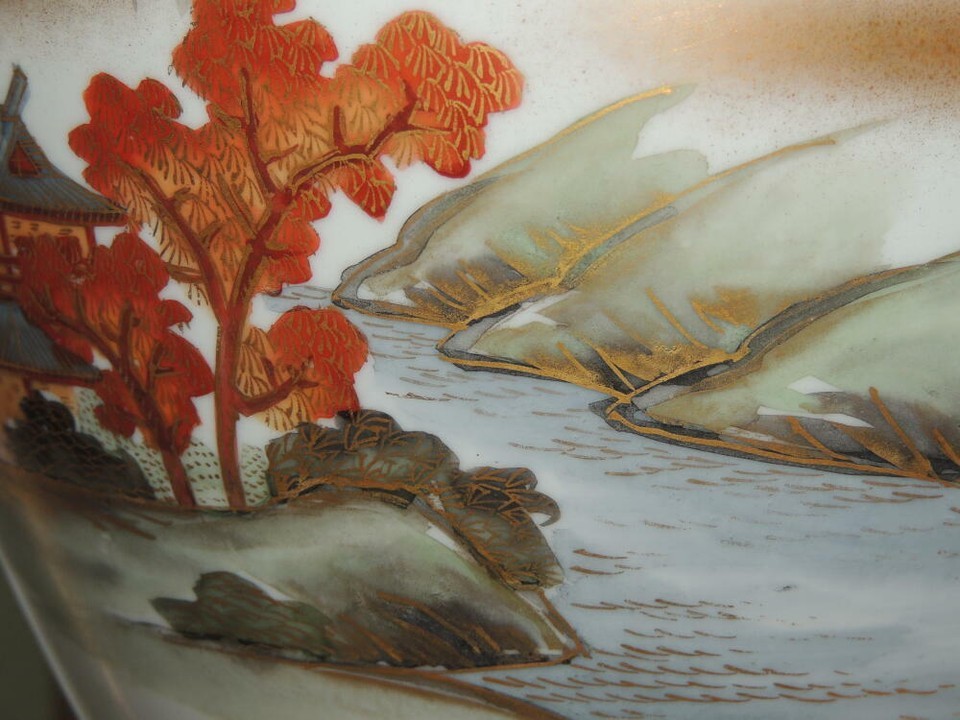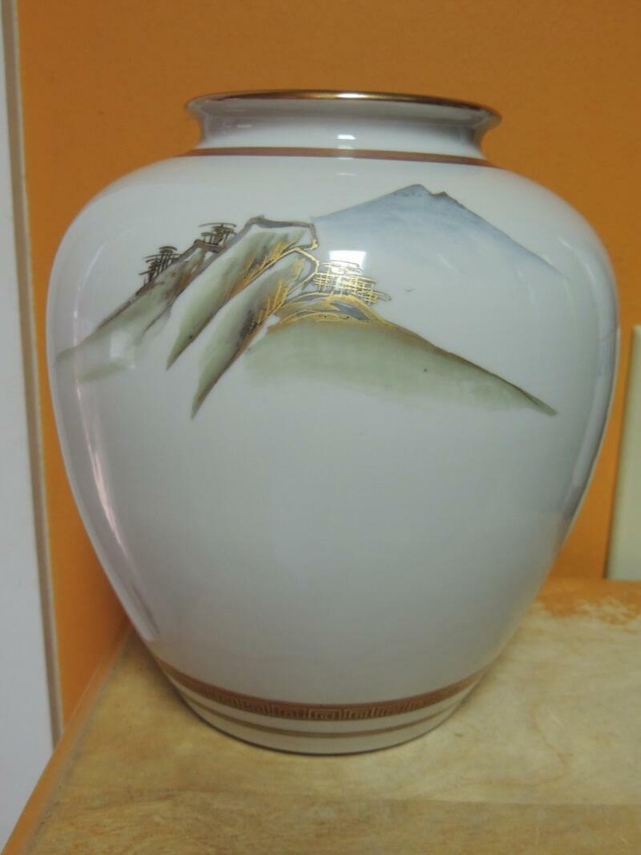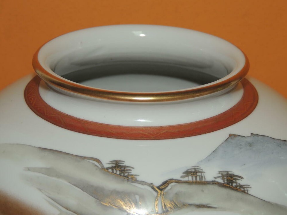 - Hand Painted Kutani Vase 7" White Gold mountain stream house mark Antique Meiji