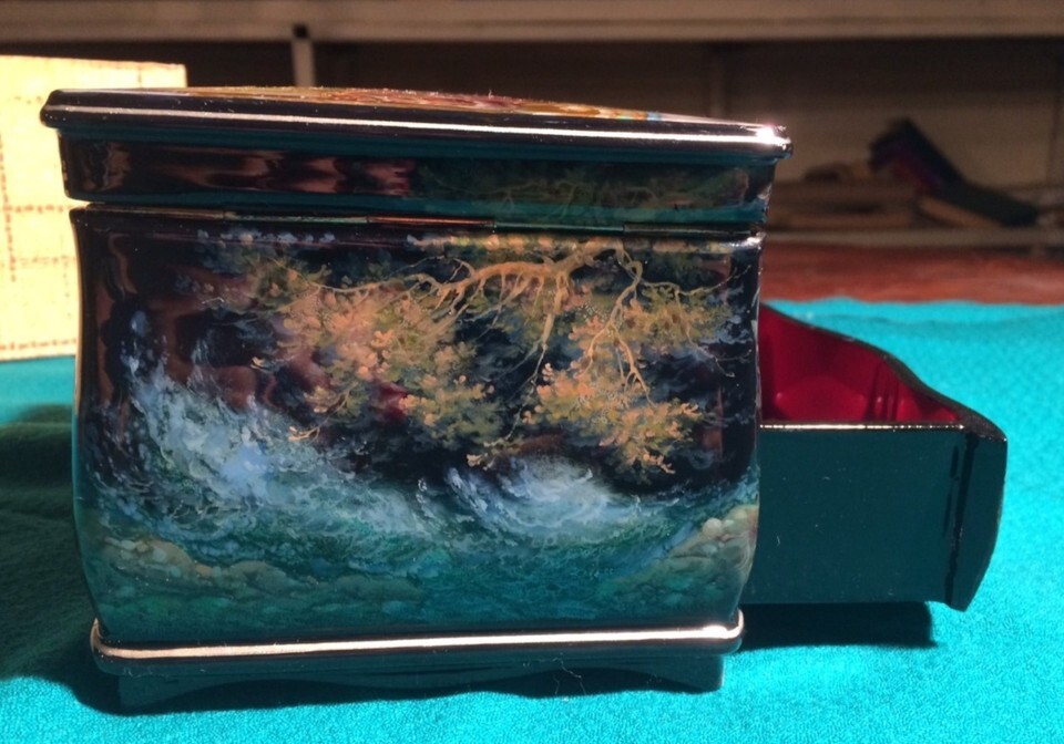 Il s'agit d'une boîte en laque peinte par l'artiste Fedoskino Dimitry Rogatov. Il s'agit d'une ?uvre peinte par lui en 2016 qui a maintenant decide de la vendre. Dimitry est le frere cadet de l'artiste Sergey Rogatov dont les cartons se vendent plusieurs milliers de dollars. Dimitry est diplome de l'ecole Fedoskino de miniatures en laque russe, la deuxieme plus ancienne ecole des quatre ecoles d'art des boîtes en laque.