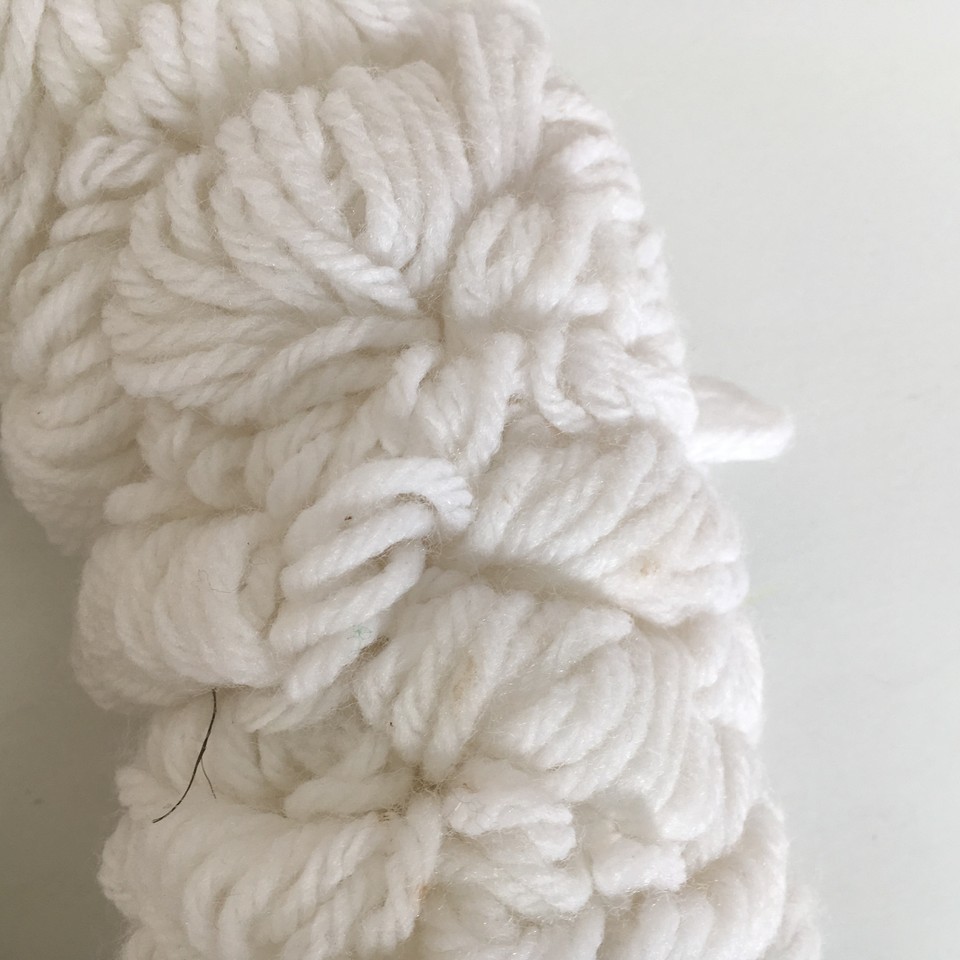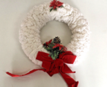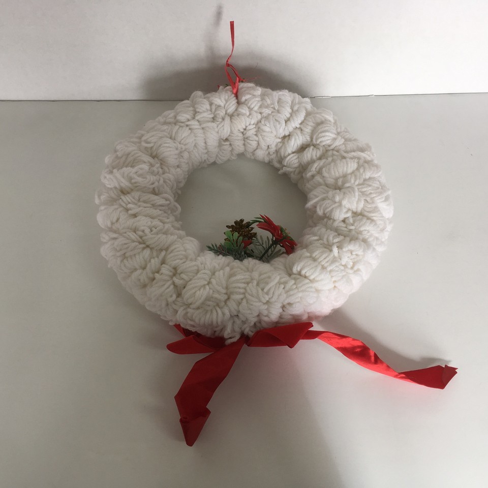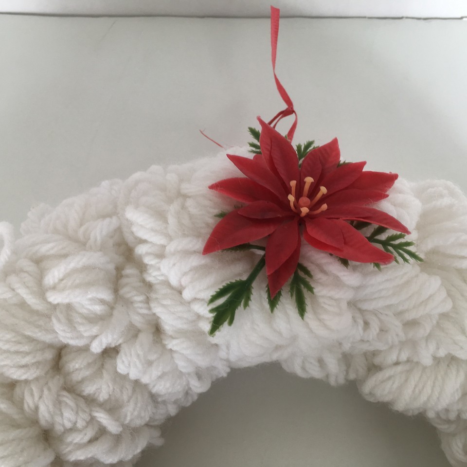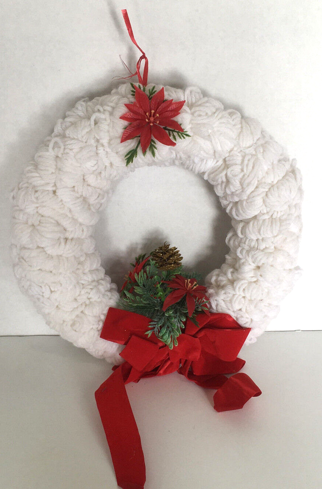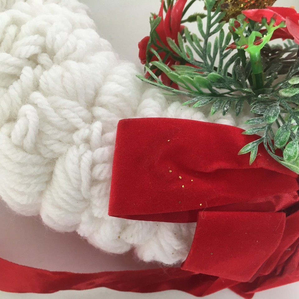 - Handcrafted VTG loop yarn Christmas winter wreath white red plastic flowers