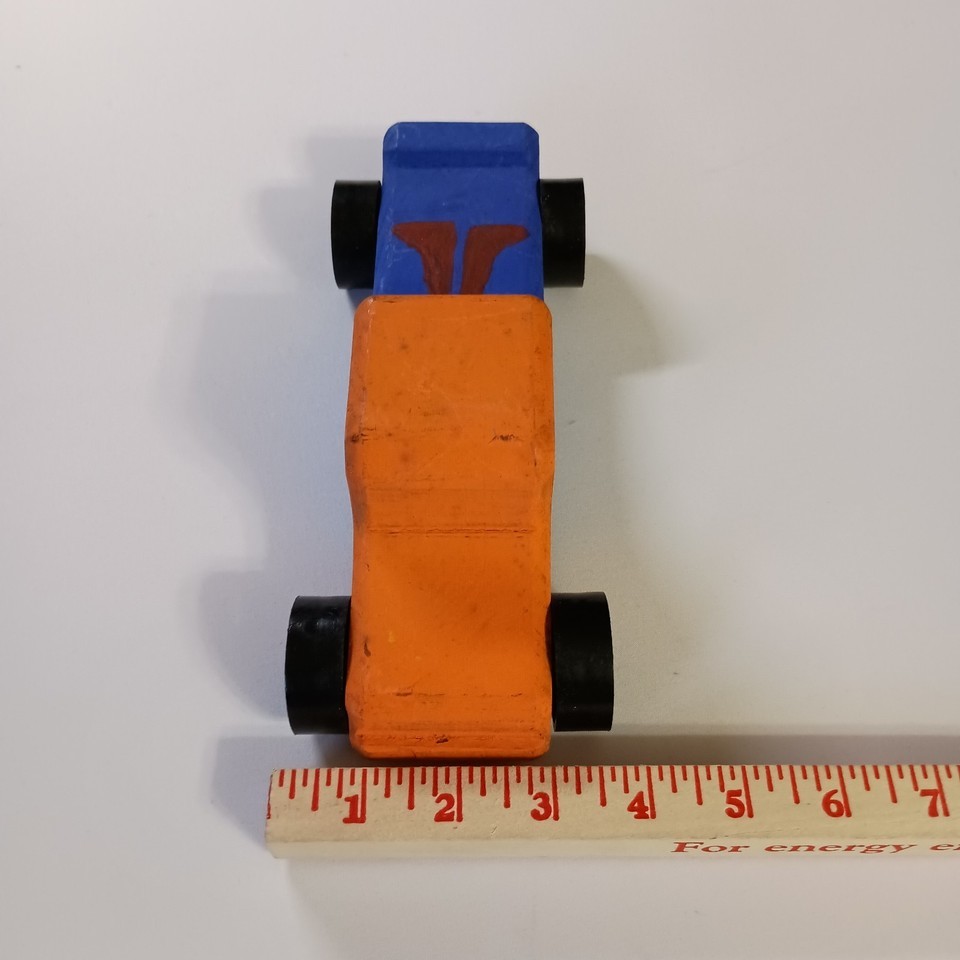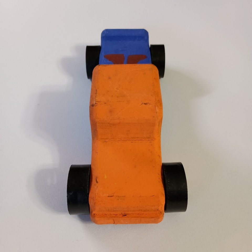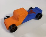 This unique handmade wooden truck is a custom creation with a vibrant orange and purple color scheme. Measuring approximately 9 inches in length, it features plastic wheels for smooth rolling action. Crafted from scratch, this one-of-a-kind toy showcases intricate detailing and craftsmanship, making it a standout piece for display or play. Normal wear.