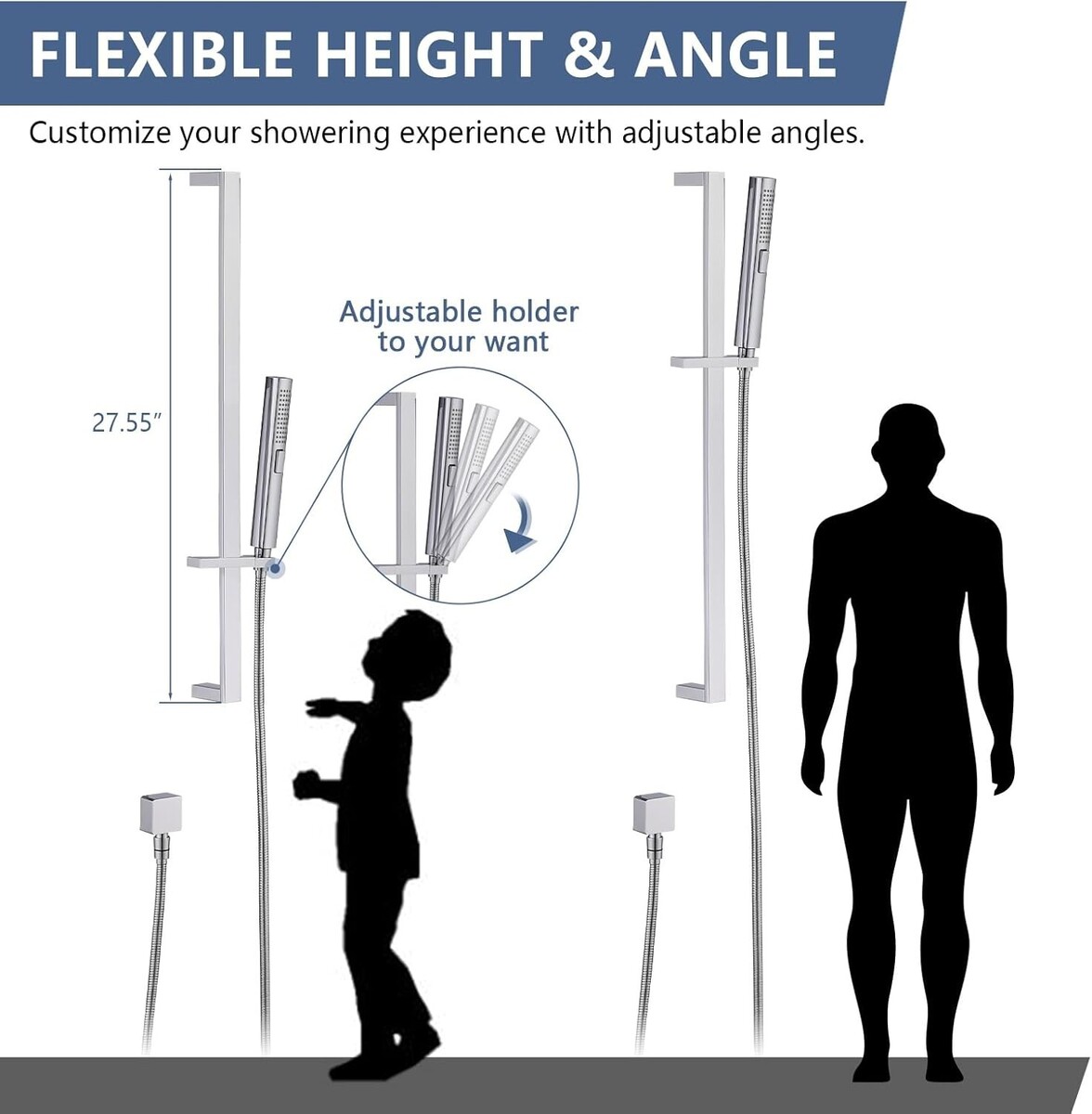 Height Adjustable Shower Slide Bar: Slide bar is 27.5 inches long, allowing you to easily adjust the height of the hand shower, it ensures a customized and comfortable shower experience for everyone in your family, from kids to adults