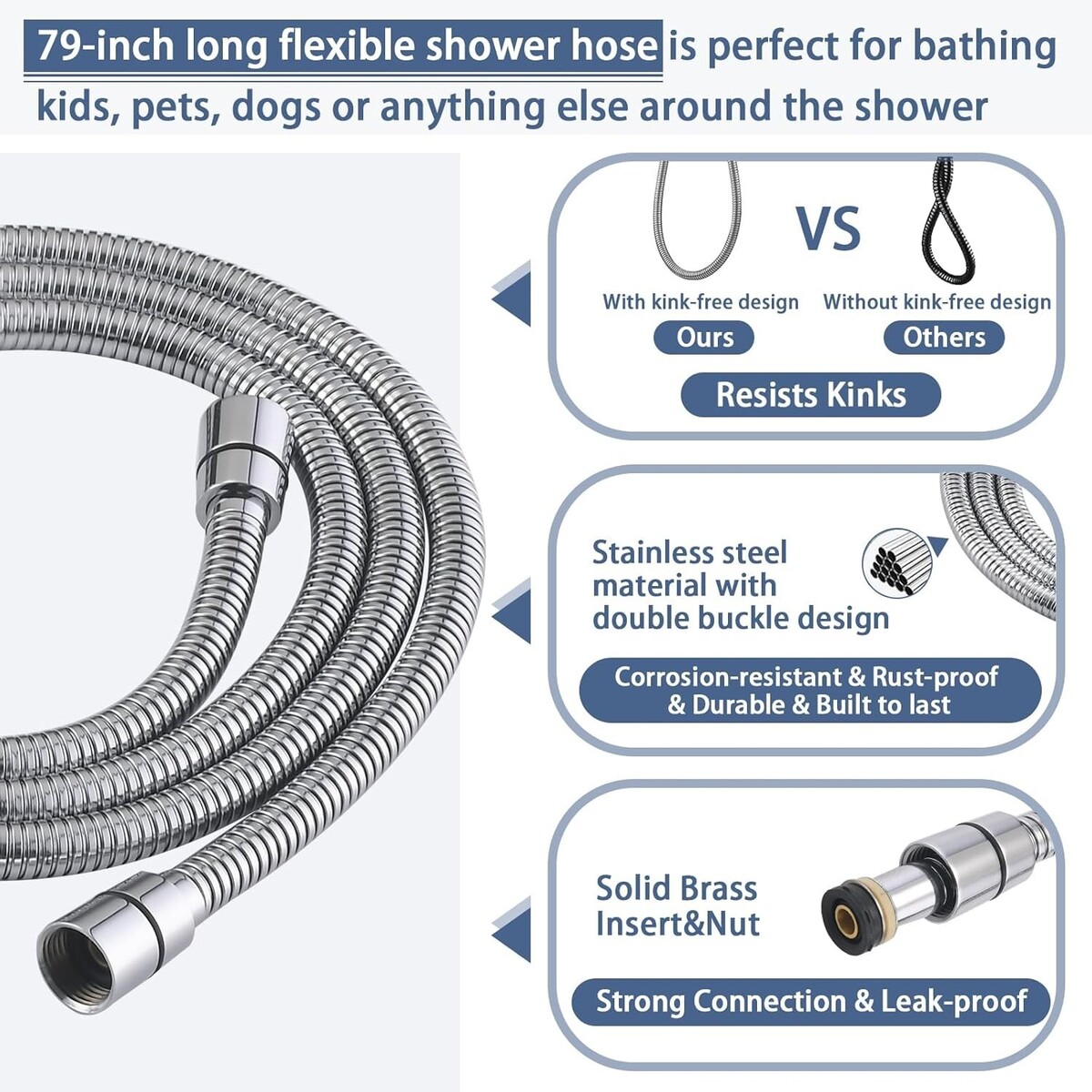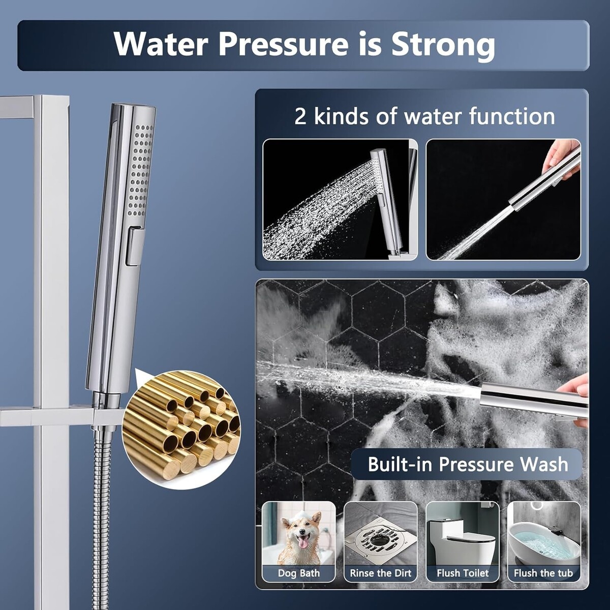 High Perssure Spray: Two modes handheld showerhead is made of high-quality brass metal, ensuring built to last. With just a press of a button, you can easily switch the shower mode from regular to high-pressure spray, suitable for rinsing and pet bathing