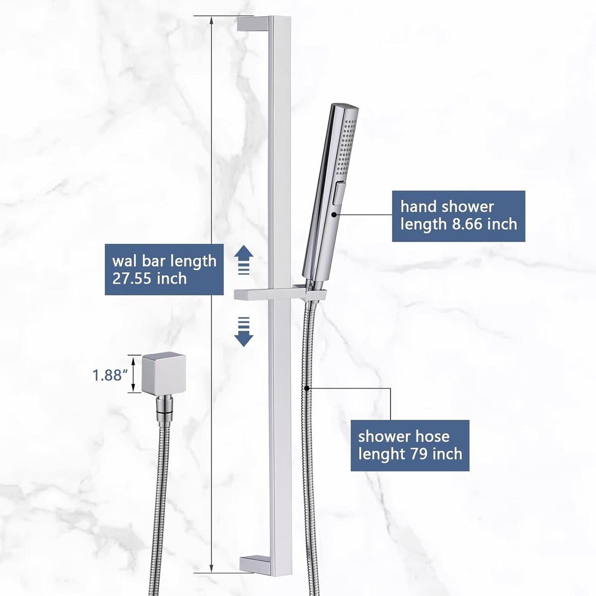 Slide Bar, Hand Held Shower, Hose, Wall Supply Elbow |