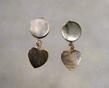These handmade earrings feature shimmering abalone shell hearts suspended from round abalone discs, creating a simple yet elegant dangle design. The natural iridescence of the abalone reflects hues of gray, silver, and soft rainbow tones, making each pair unique.