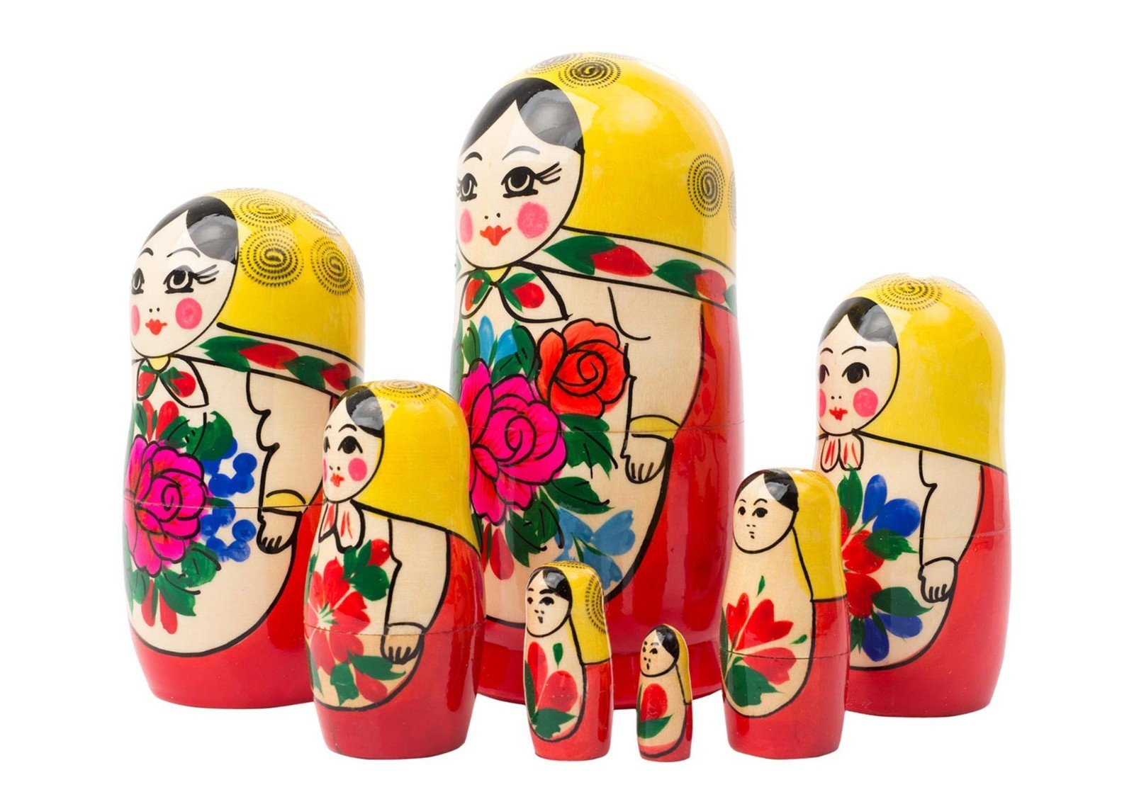 Traditional Semenov dolls are a study in graphic simplicity, a folk style that has endured over the decades. Offered here in a 7 piece version; a good piece with which to introduce a favorite youngster to the joys of matryoshka collecting! Fully handpainted in Russia.