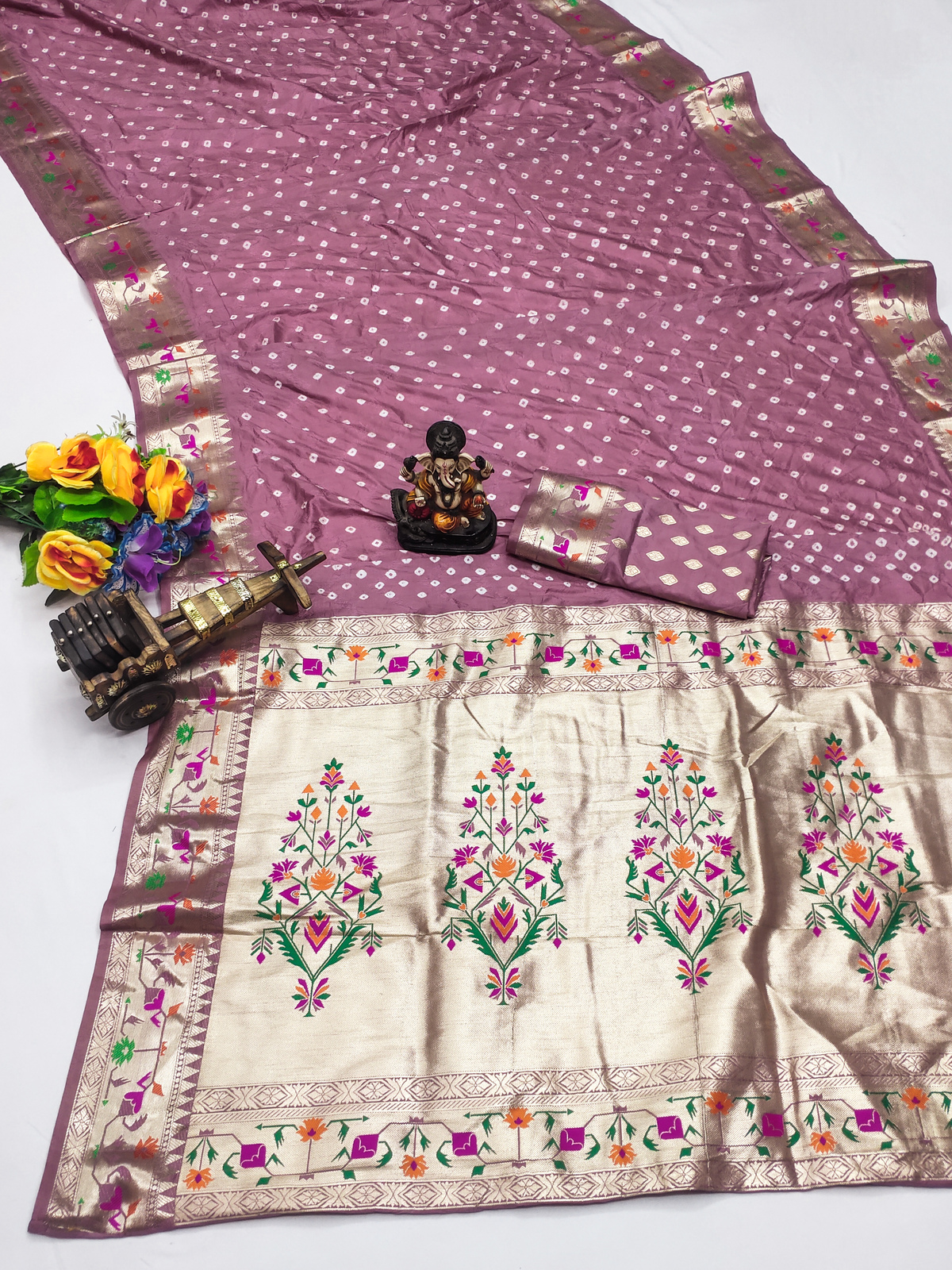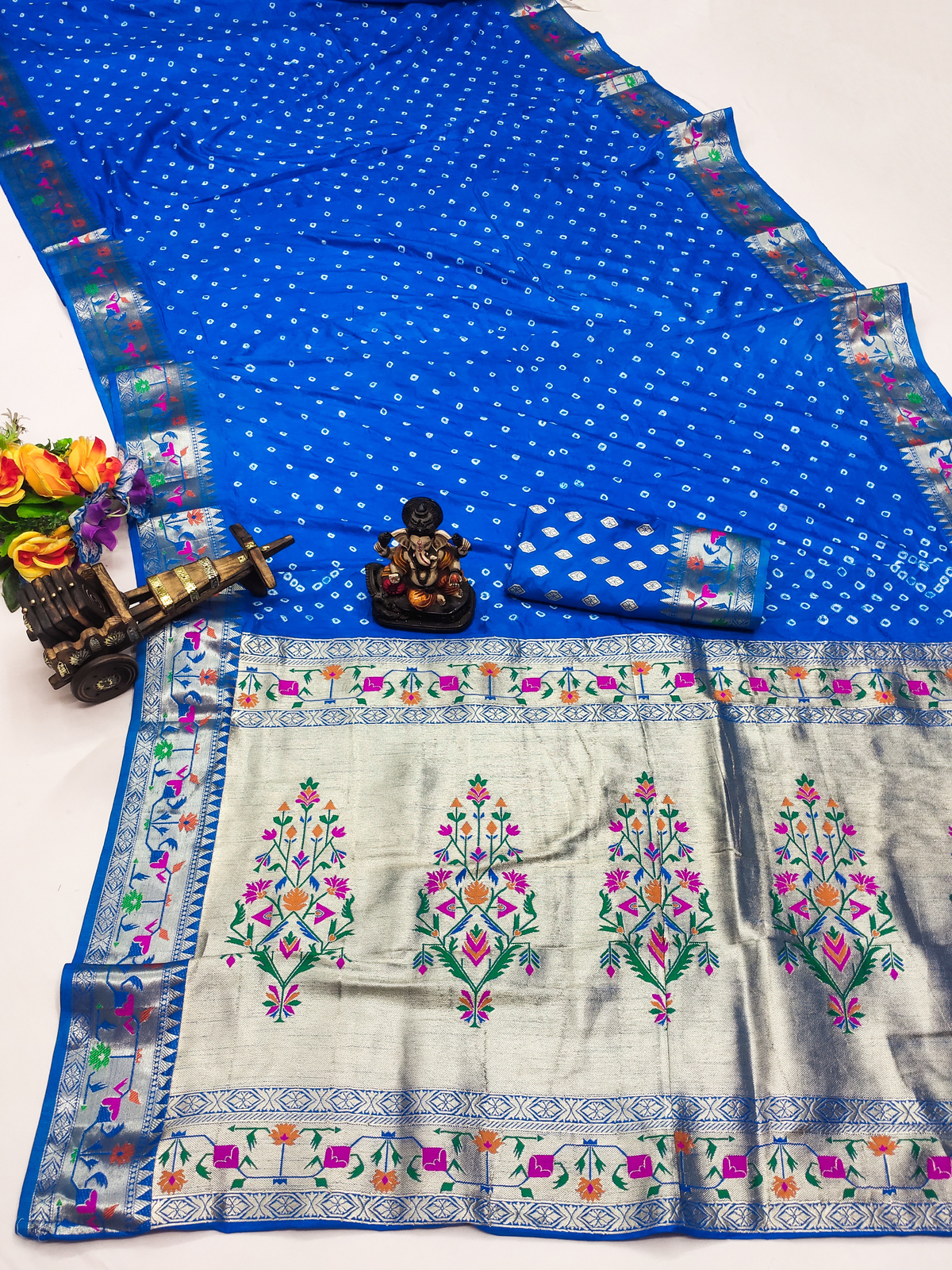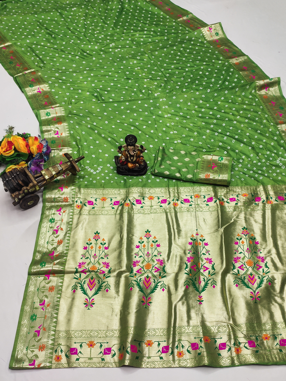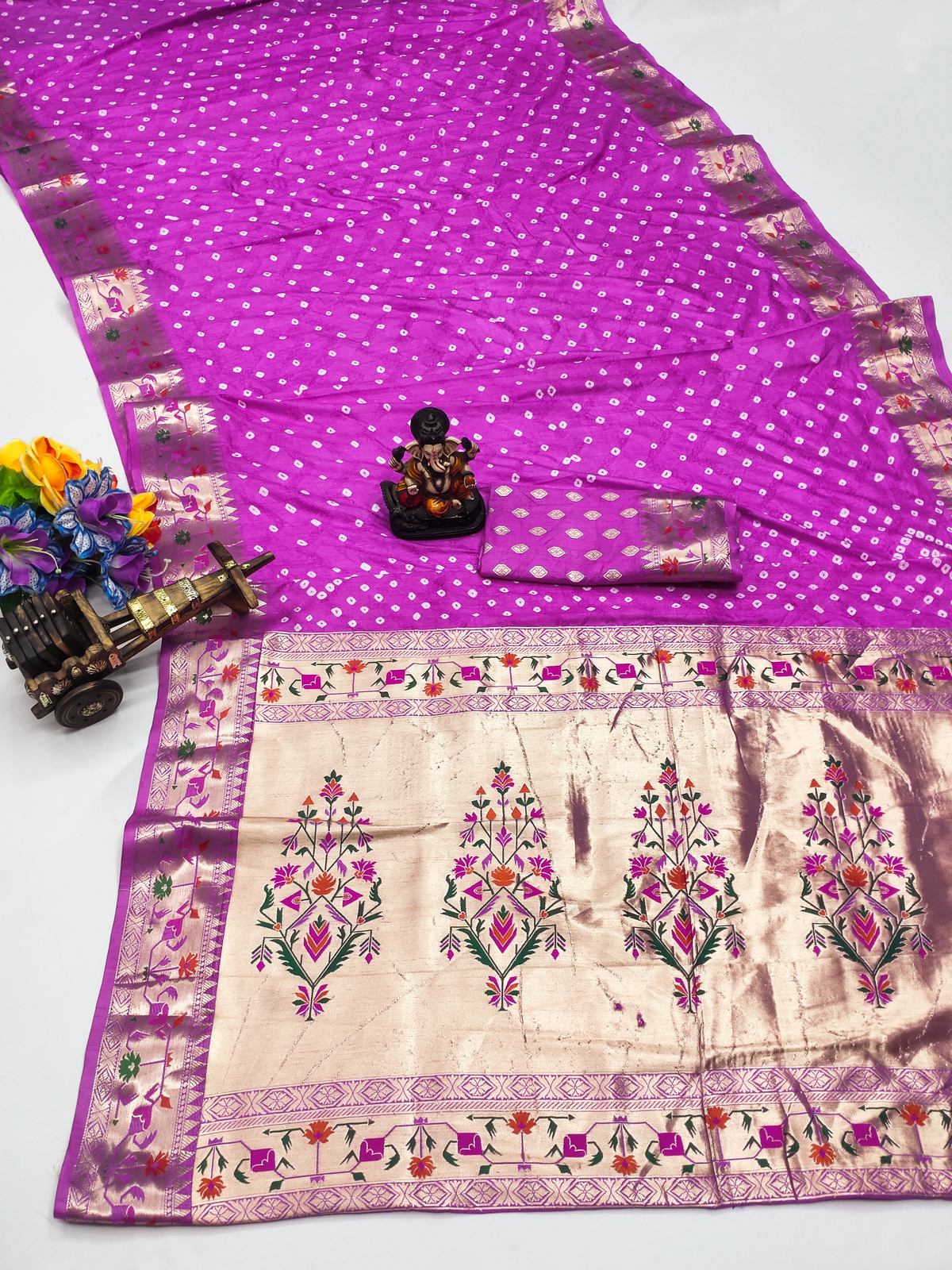- Handmade Bandhej With Awesome Two Sides Jari Paithani Weaving Border Sarees