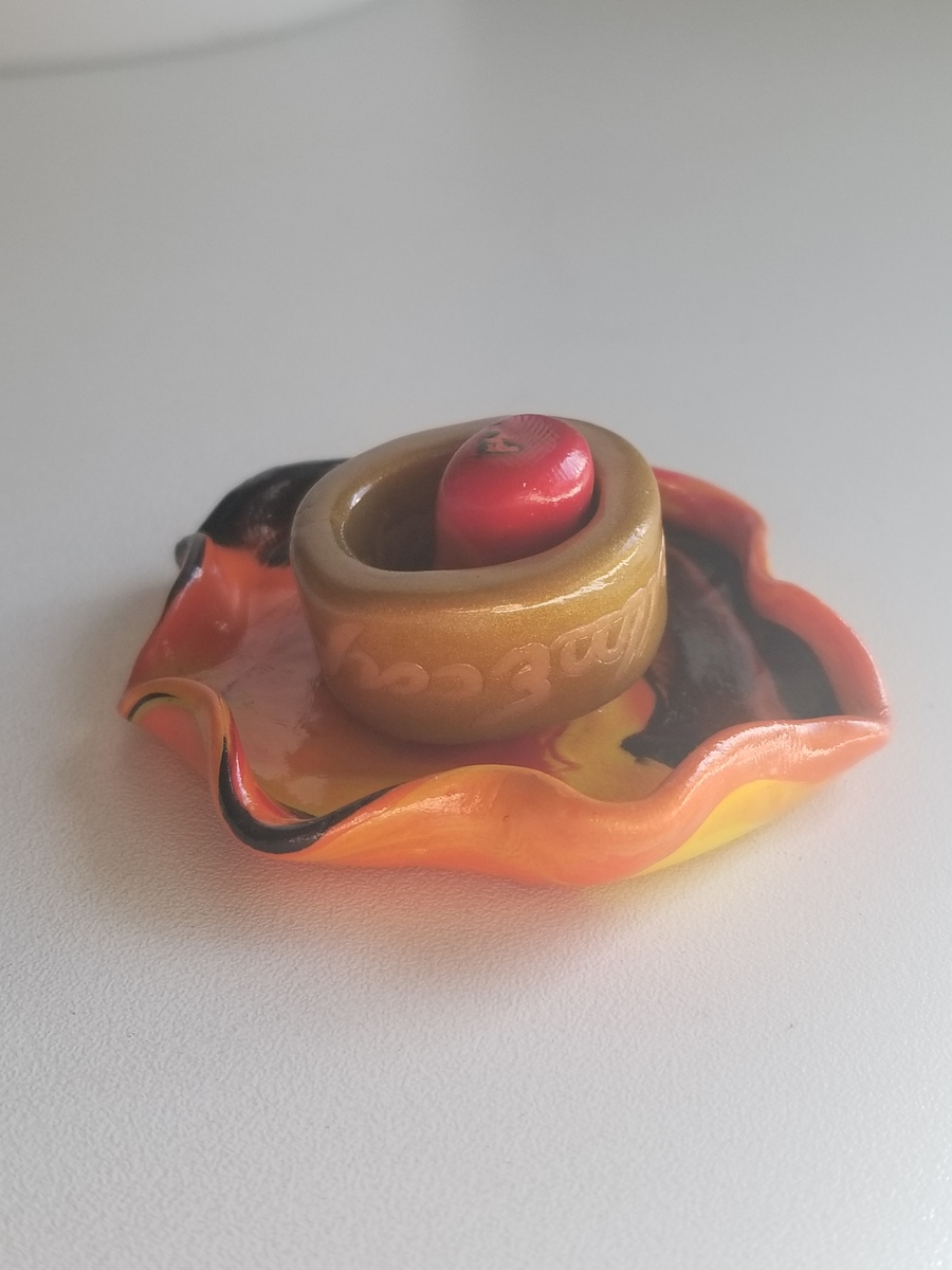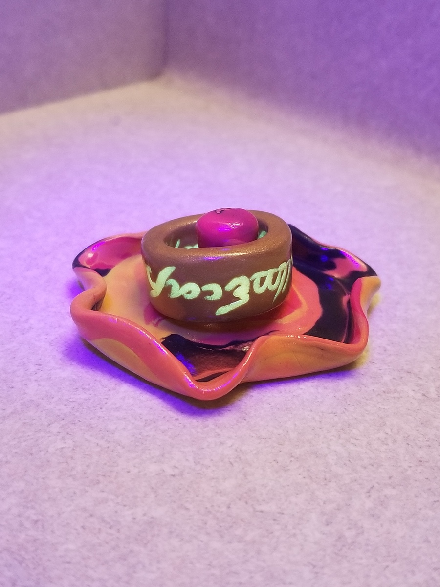 Handmade Clay Glow-in-the-dark "One Ring" inspired Ring Stand Set. Collectible Ring with Glow-in-the-dark inscription on inside and outside, with marbled lava inspired ring stand. Clay is glazed with a satin glaze.