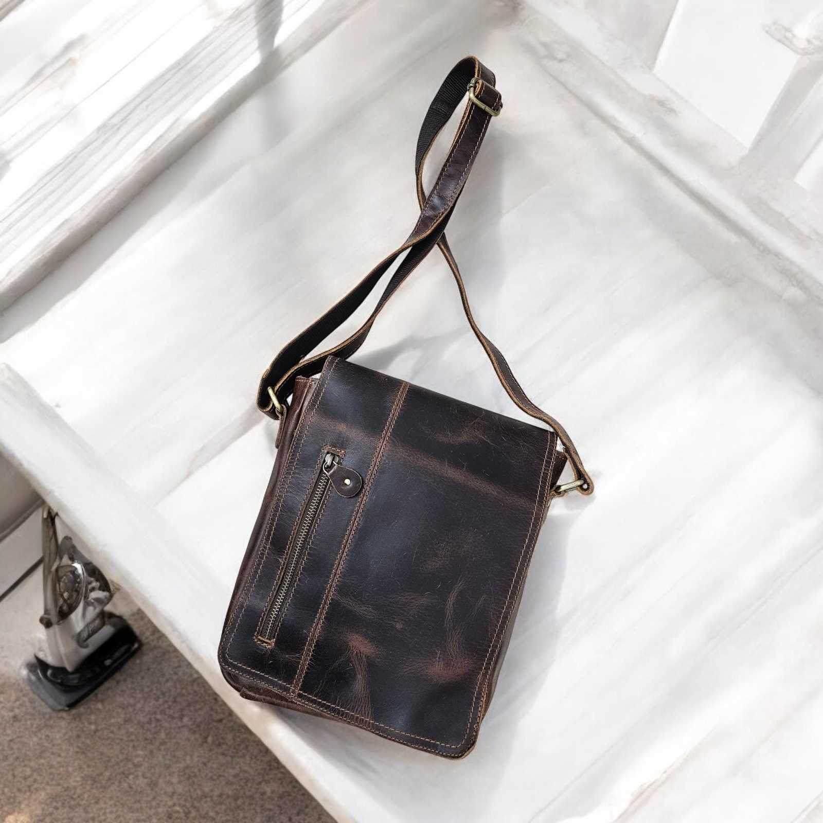 Discover timeless functionality with this Handmade Dark Brown Leather Sling Bag—a compact crossbody bag crafted from 100% genuine leather with a luxurious marble-textured finish. Designed to carry your essentials in style, this unisex piece blends rustic charm with modern utility.