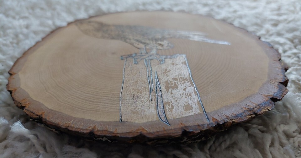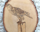 This is a new wood burner?s art piece of a hawk on a pine slab that I purchased from a guy at the art fair for my husband's office, but it didn't fit in the spot it was purchased for. Great detailing, the piece measures about 10 oe? in height by 8? in width, by just under 1? in depth. There is a hanger on the back for display. We are a smoke-free home.