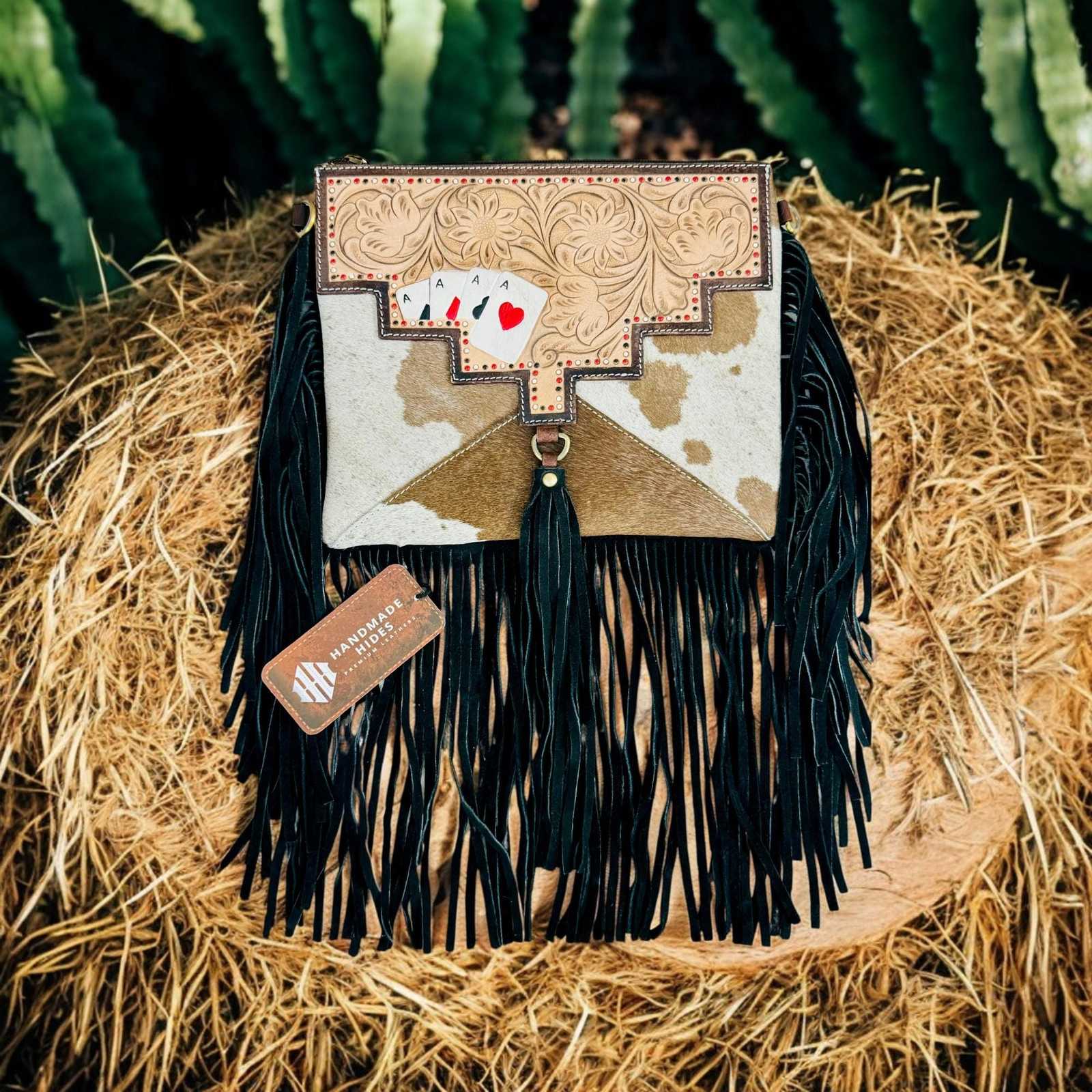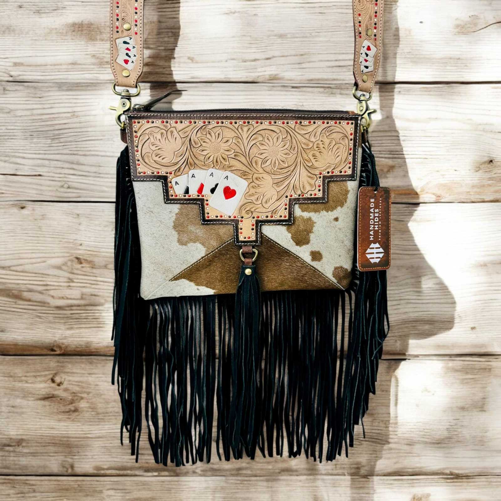 - Handmade Hair-On Leather Crossbody, Western Boho Fringe Purse, Rustic Shoulder B