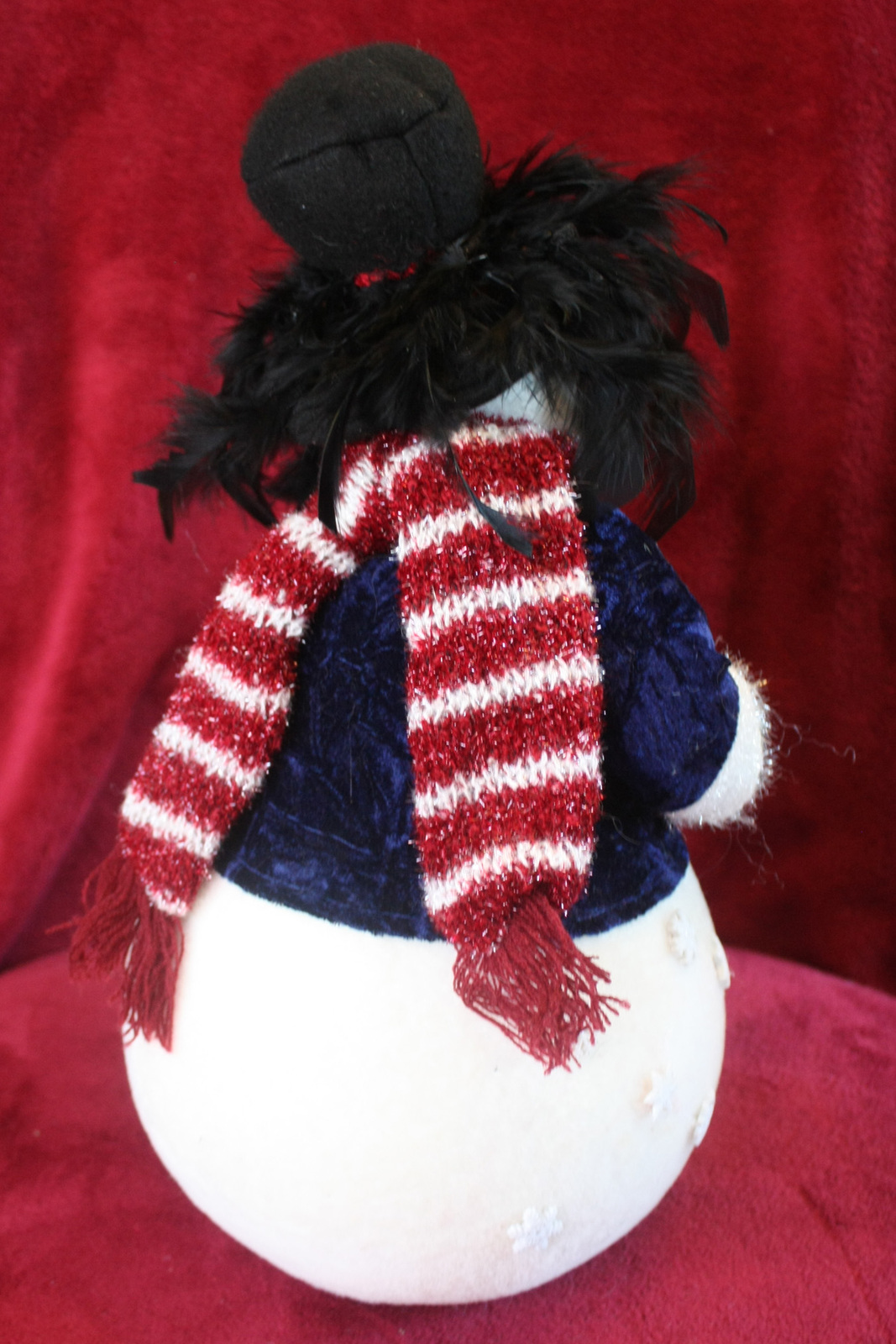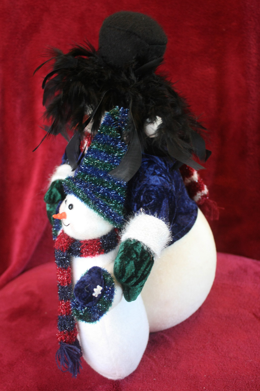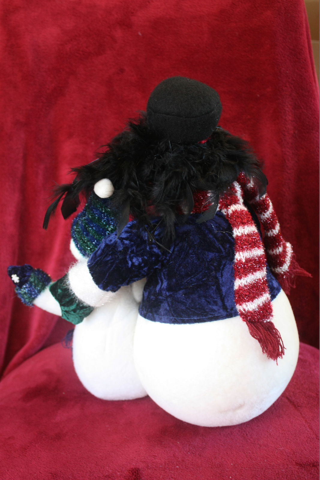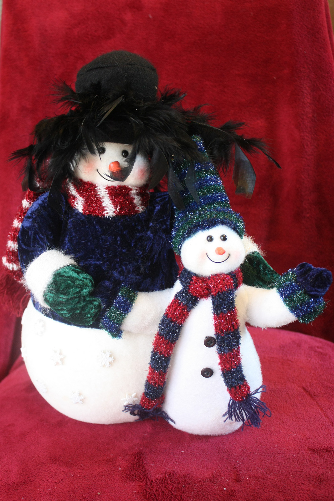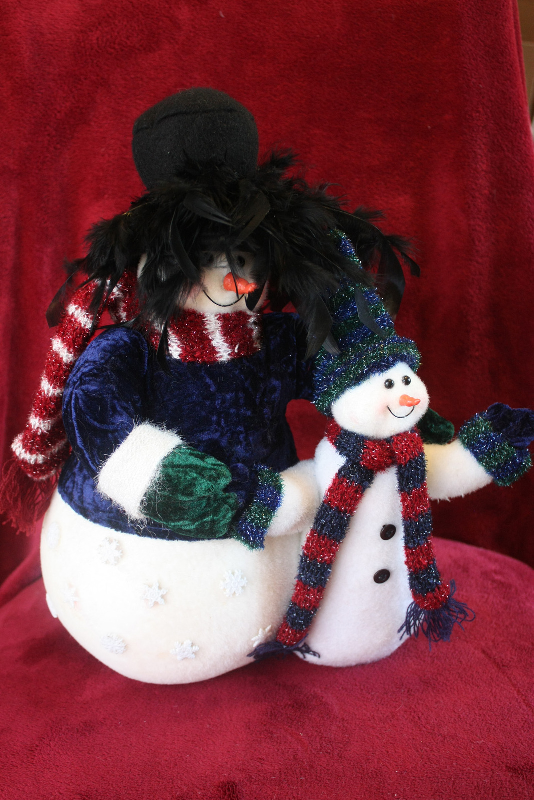 This is a handcrafted pair of snowman all dressed up for the holidays. It is a mother with child made with a variety of materials. The piece is in great condition. It is 15" x 12" x 8".