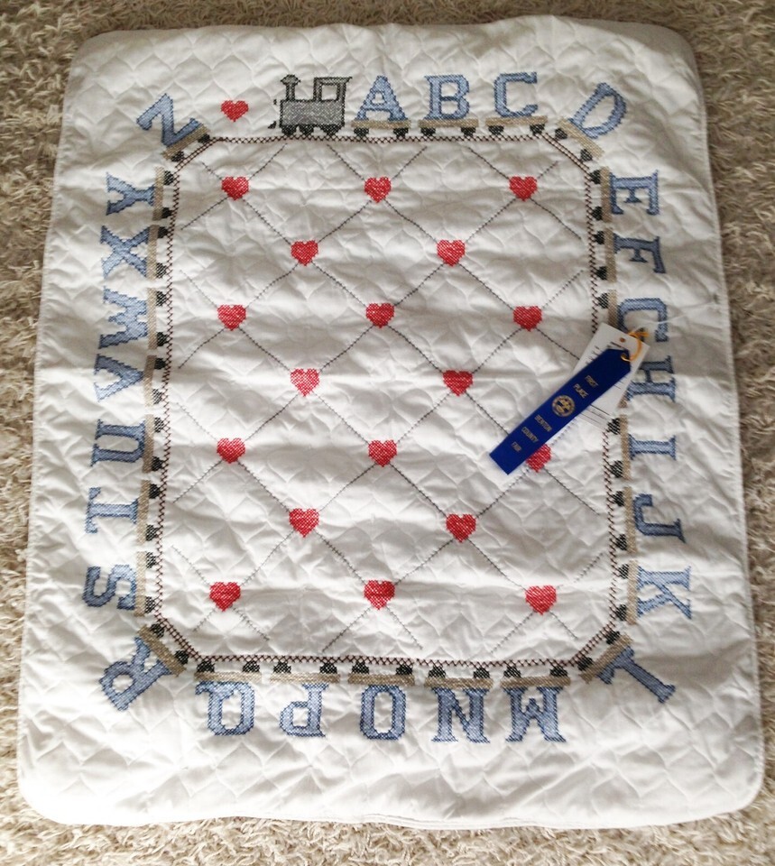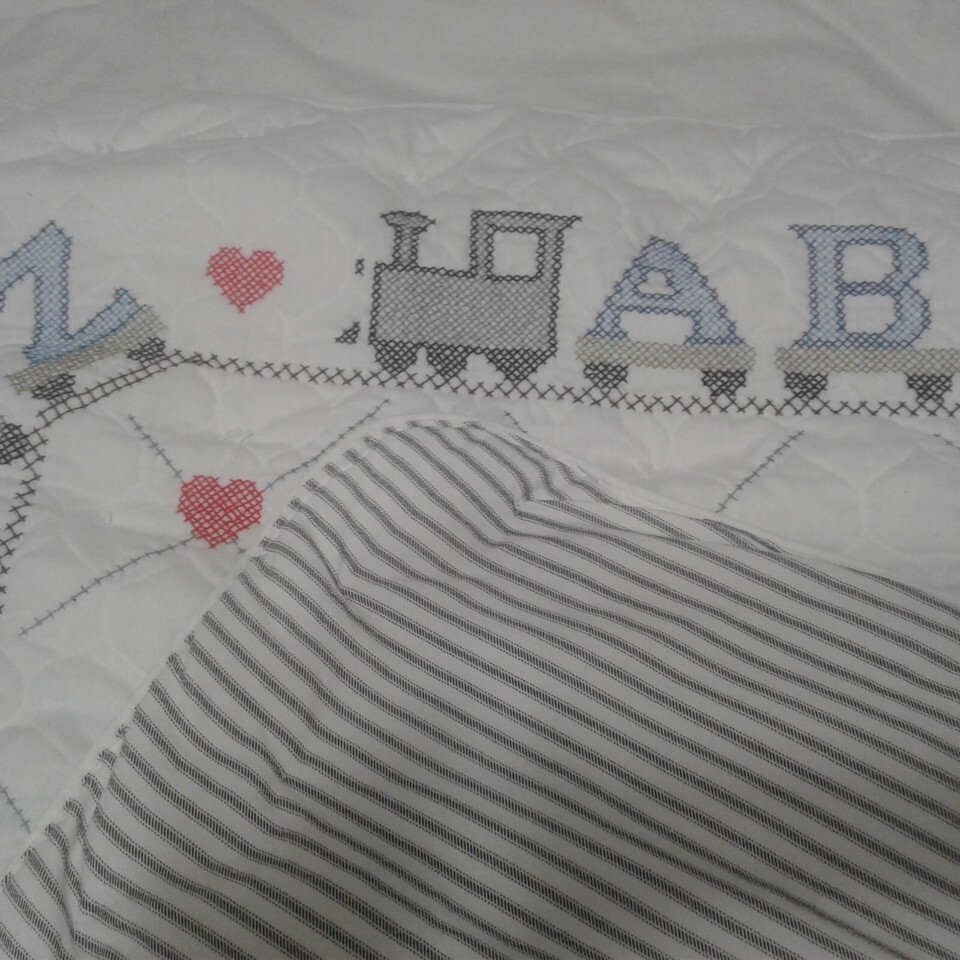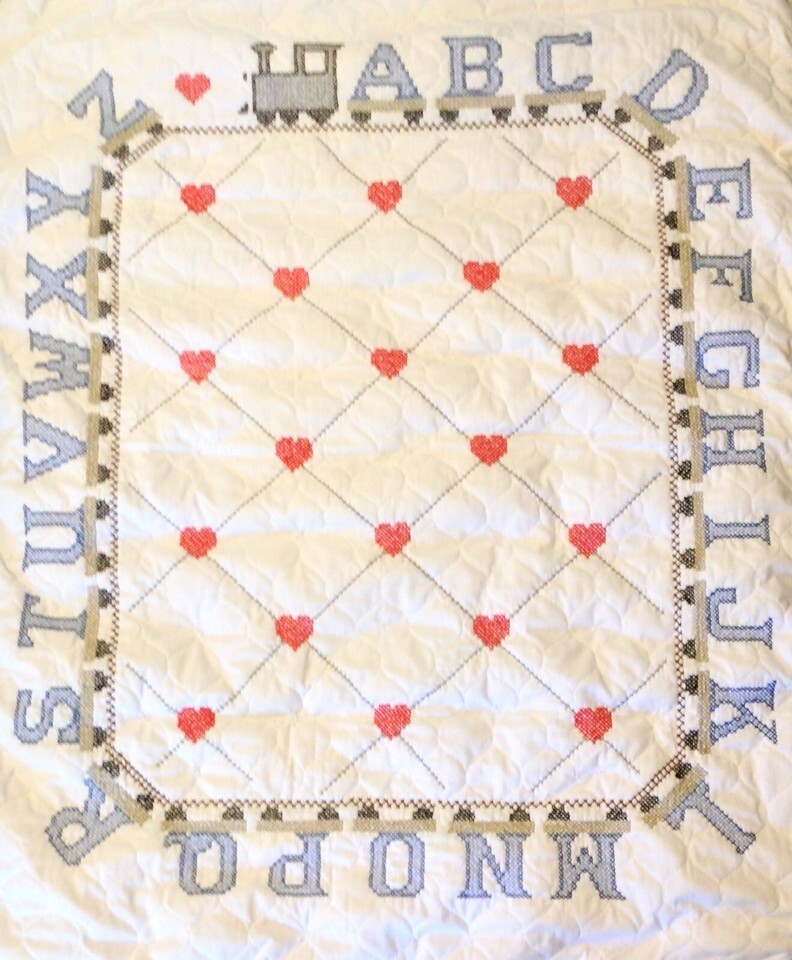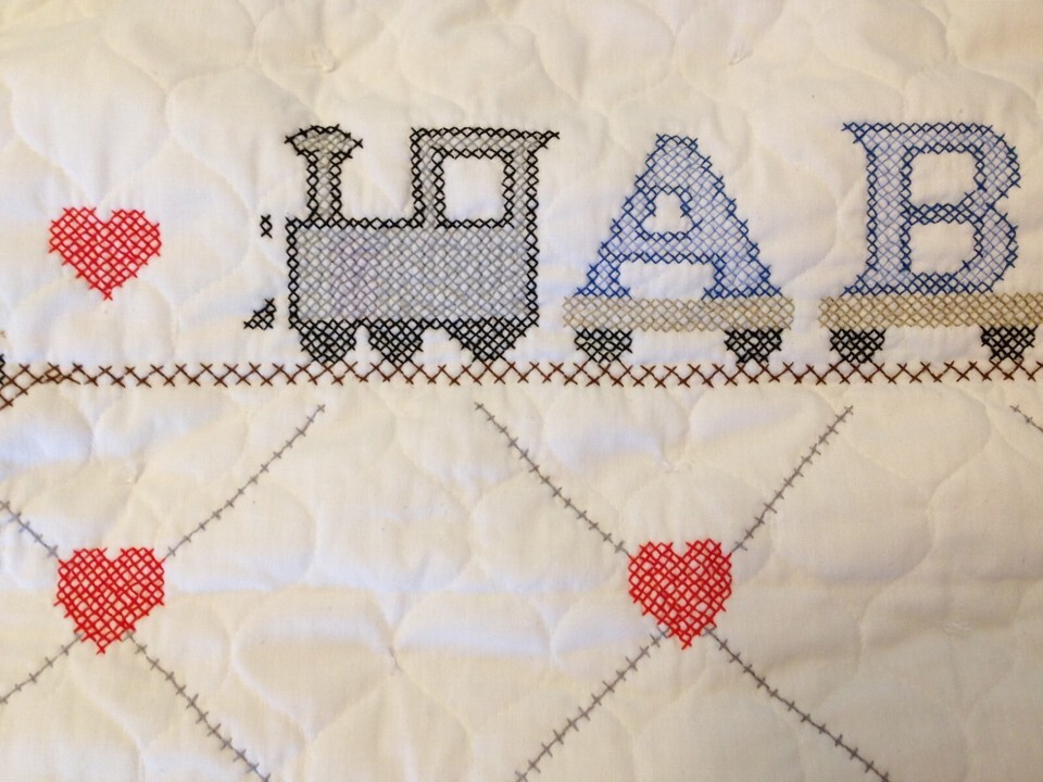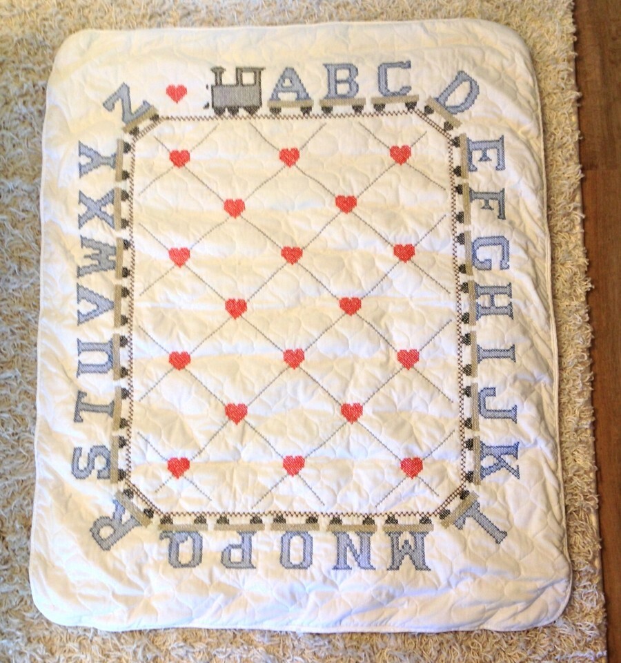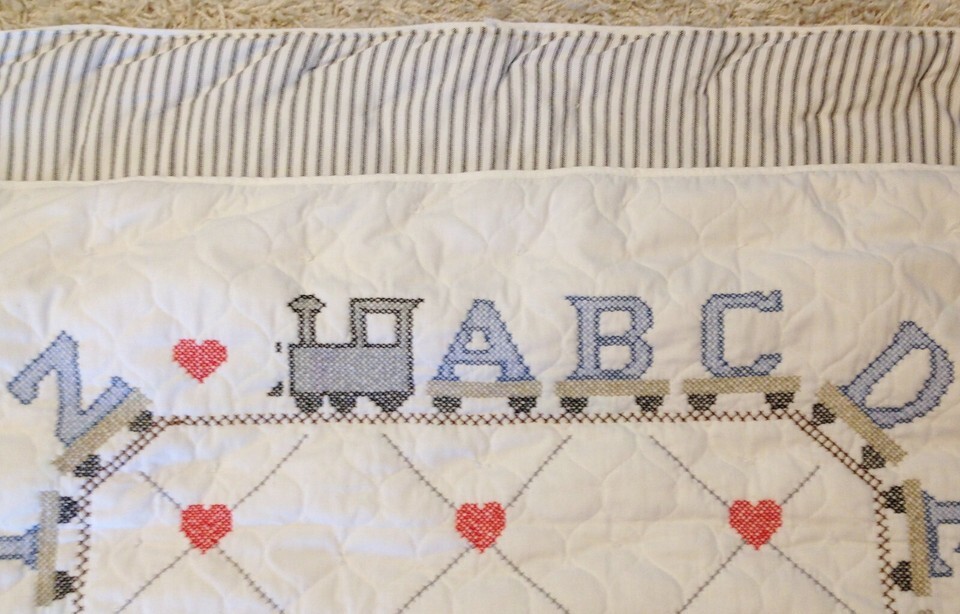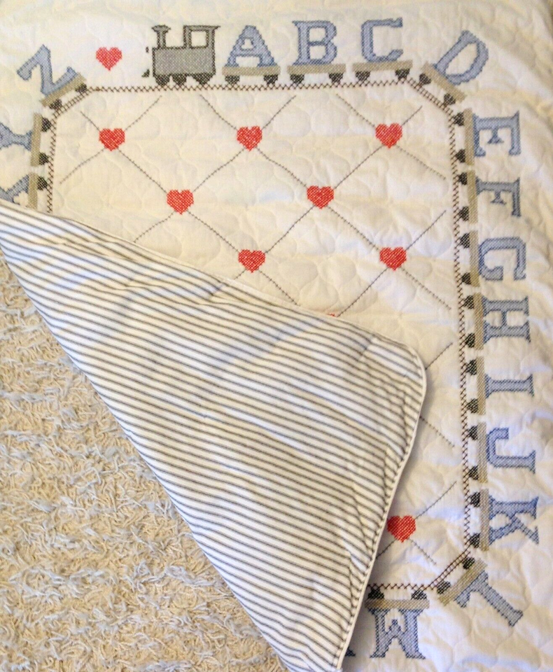This is a new heritage baby quilt with hand-embroidered detailing featuring an alphabet train. The backing is 100% organic cotton calico with a ?ticking? design.