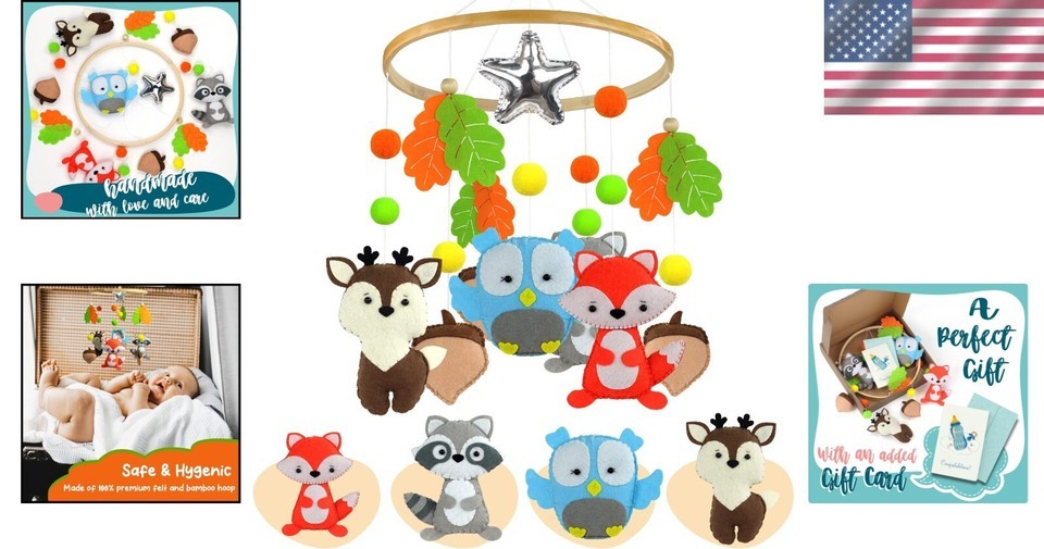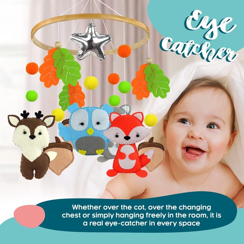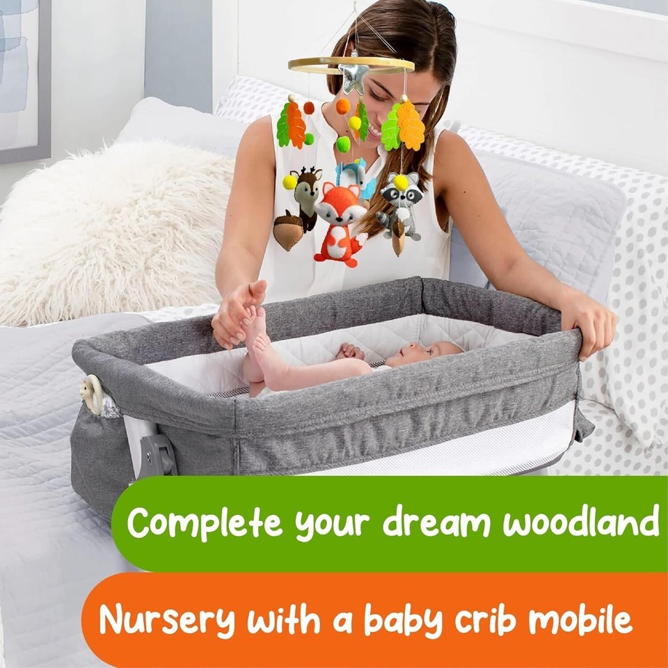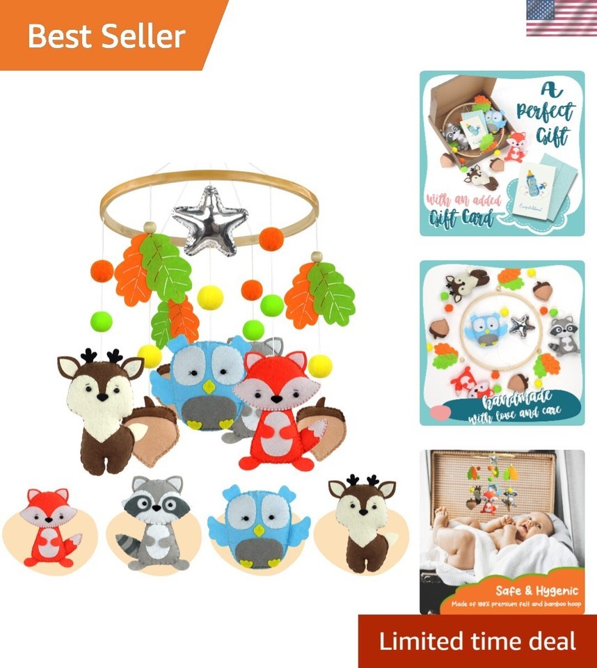 Adorable Woodland Theme: Complete your dream woodland nursery with this enchanting baby crib mobile featuring delightful woodland animals such as a fox, raccoon, deer, and owl.