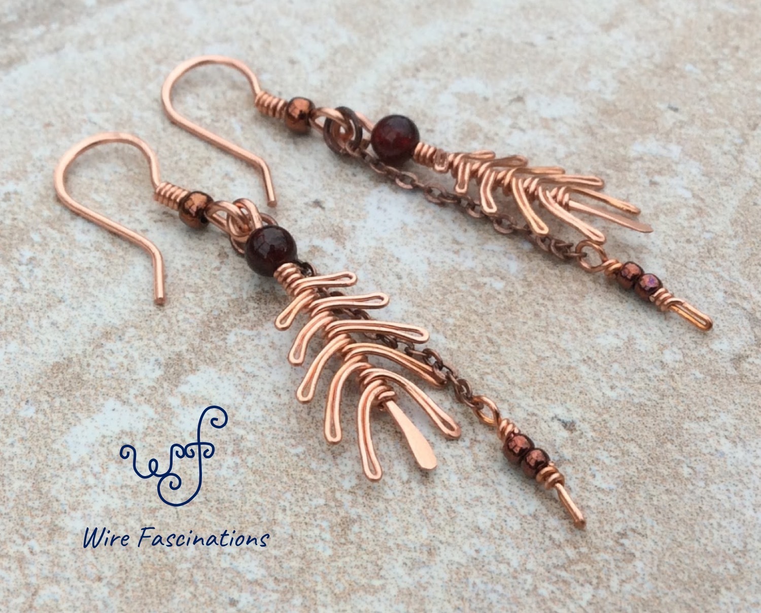These handmade copper earrings are feathers with garnet and long fine chain beaded dangles. The ear wires are also made by hand from copper wire. This is an artistic, versatile and eye catching design suitable for any occasion.