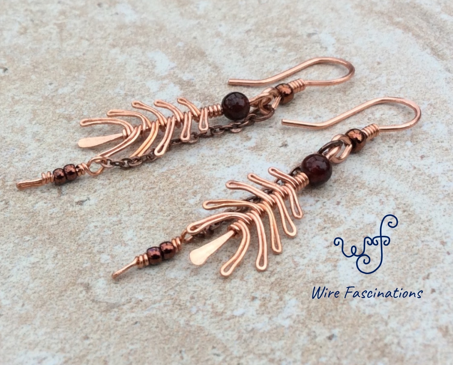 - Handmade copper feather earrings with garnet and fine chain dangles