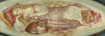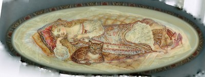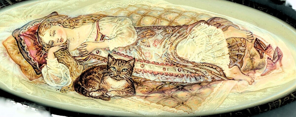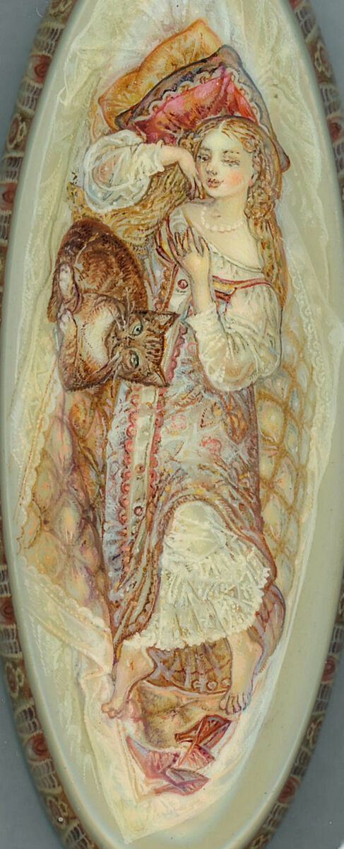 - Handpainted Fedoskino Russian Lacquer box "A Lady and her Cat" by N.V. Bychkova