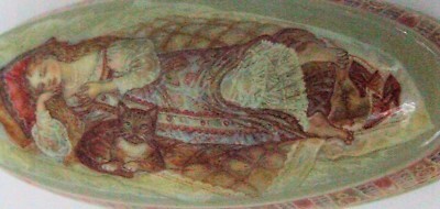 A beautiful Fedoskino Lacquer Box by the artist Bychkova titled "A Lady with her Cat". This box is hand painted and signed by Bychkova. This box is an unusual Fedoskino box as it has a box shaped like a cigar. The box itself has a Cat, very comfortable, with its mistress relaxing in the background. The size of the box itself 1.25 X 3 x .8 inches ( .5 x 1.5 x .3 cm). The box comes with her signature. Most artists don't have their respective schools authenticate their pieces so it is not absolutely necessary needed to authenticate the box usually if an artist signs the box that authenticates the piece. If no signature one should question the authenticity of the box. Nadezhda Viktorovna Bychkova was born in 1958 in the city of Kharkov, Ukraine. She finished the Moscow Technological Institute