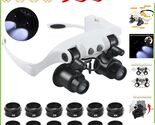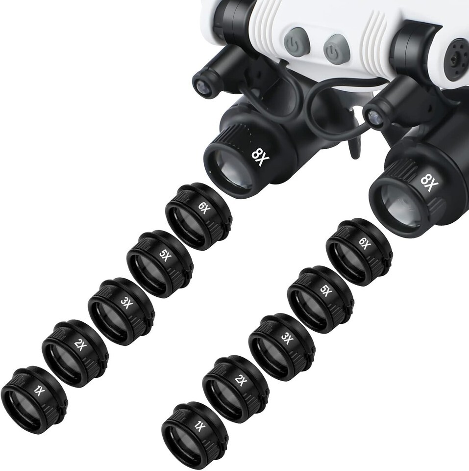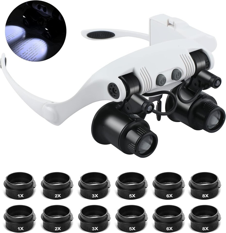 Hands-free head magnifying glasses with 6 interchangeable lenses offering 1X, 2X, 3X, 5X, 6X, and 8X magnification.