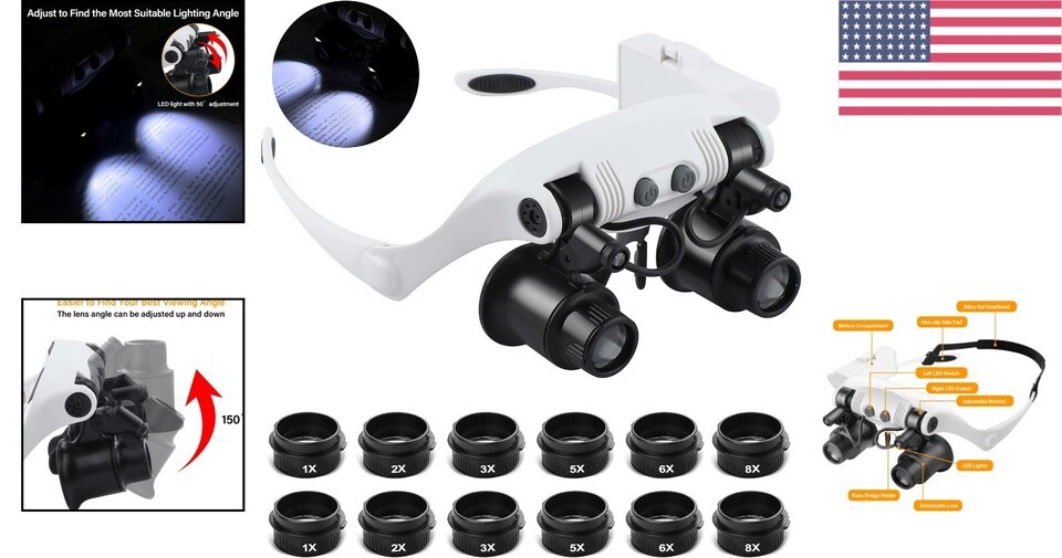 - Hands-Free Magnifying Glass with LED - 8X Adjustable Lenses for Precision Work