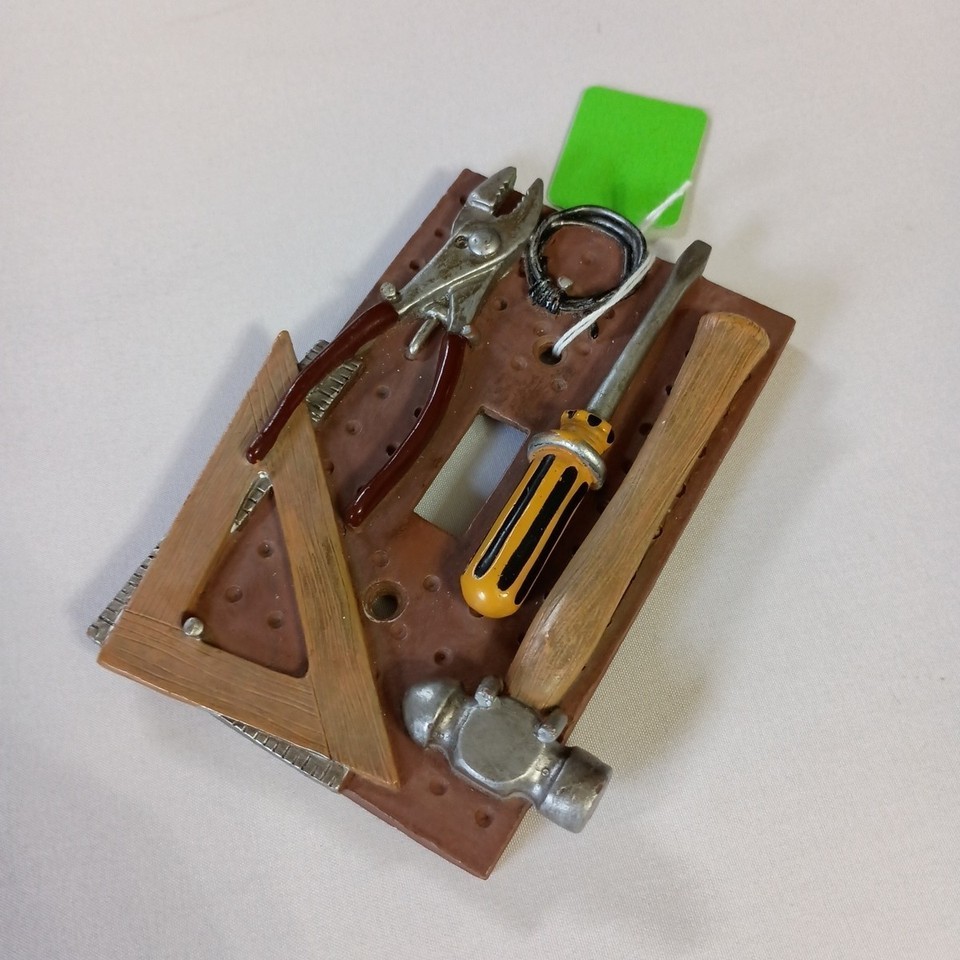 This light switch plate cover is designed for a man cave or workshop, featuring a handyman tool design in a 3D style. Made of resin material, the rectangular wall plate comes in a multicolor finish. It is specifically crafted for a light switch with a switch cover, providing both functionality and a unique decorative touch to the space. Normal wear. Screws not included!