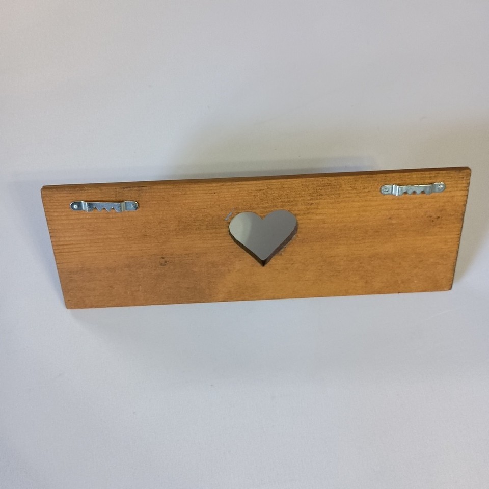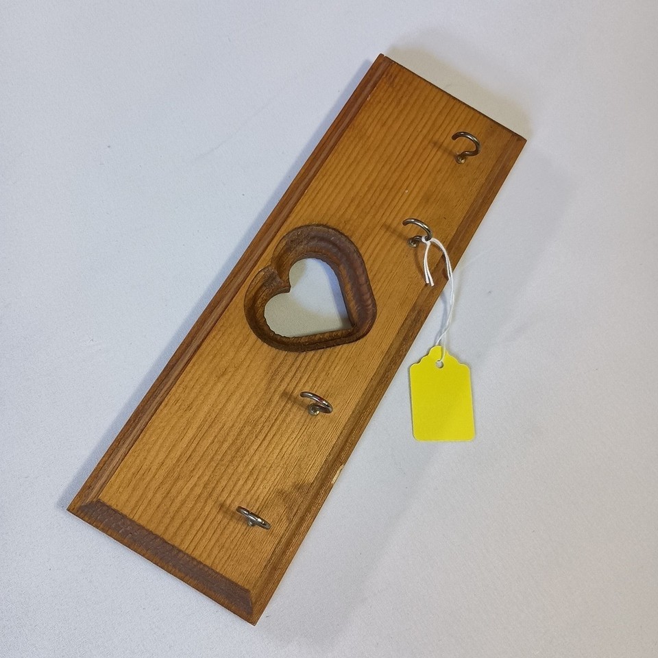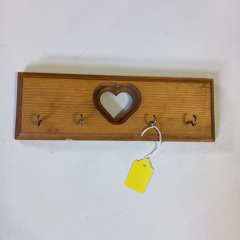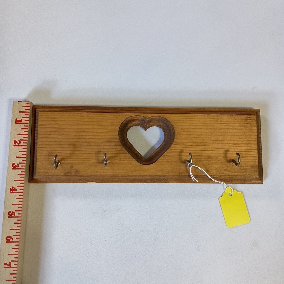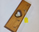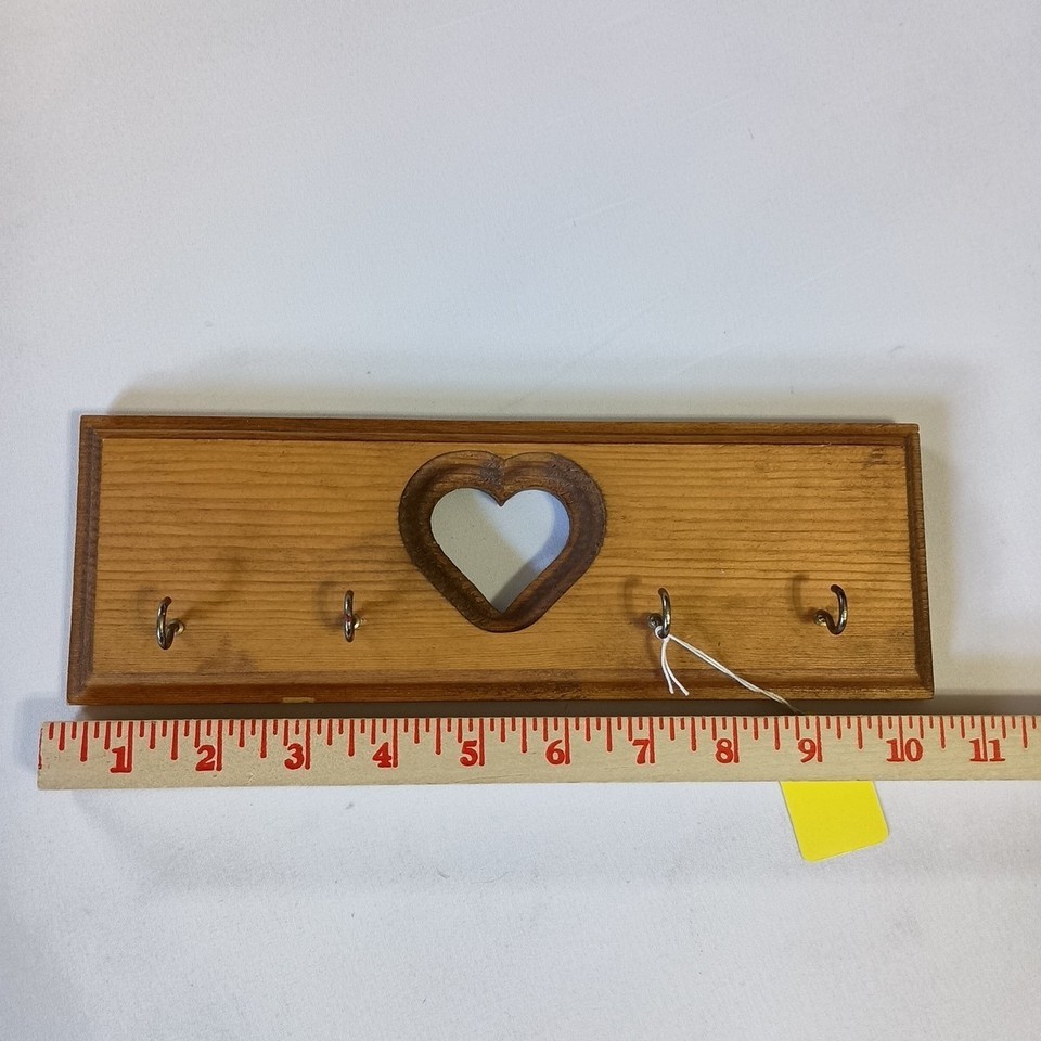 This handcrafted hanging wall plaque features a heart-shaped cutout, perfect for adding a touch of country farmhouse charm to your home decor. Made of wood with a distressed finish, this small plaque comes with 4 hooks for hanging your favorite items. The natural medium tone color and simple design make it a versatile piece that can complement a variety of styles in your living space. Normal wear, see pictures. Sizes are approximate.