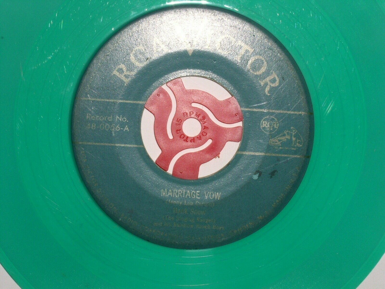 This is an original, vintage green vinyl 45 rpm phonograph record by Hank Snow entitled, "Marriage Vow". Flipside: "The Star Spangled Waltz". Record label RCA 48-0056.