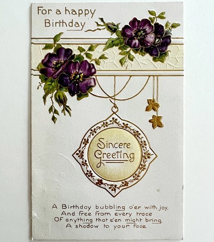 - Happy Birthday Sincere Greeting Postcard 1910 Purple Flowers Embossed PCBG3D
