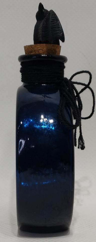 Spooky Bat Stopper: The bottle is sealed with a cork stopper, topped by a menacing black bat figure with outstretched wings, adding a distinctly gothic and Halloween vibe.