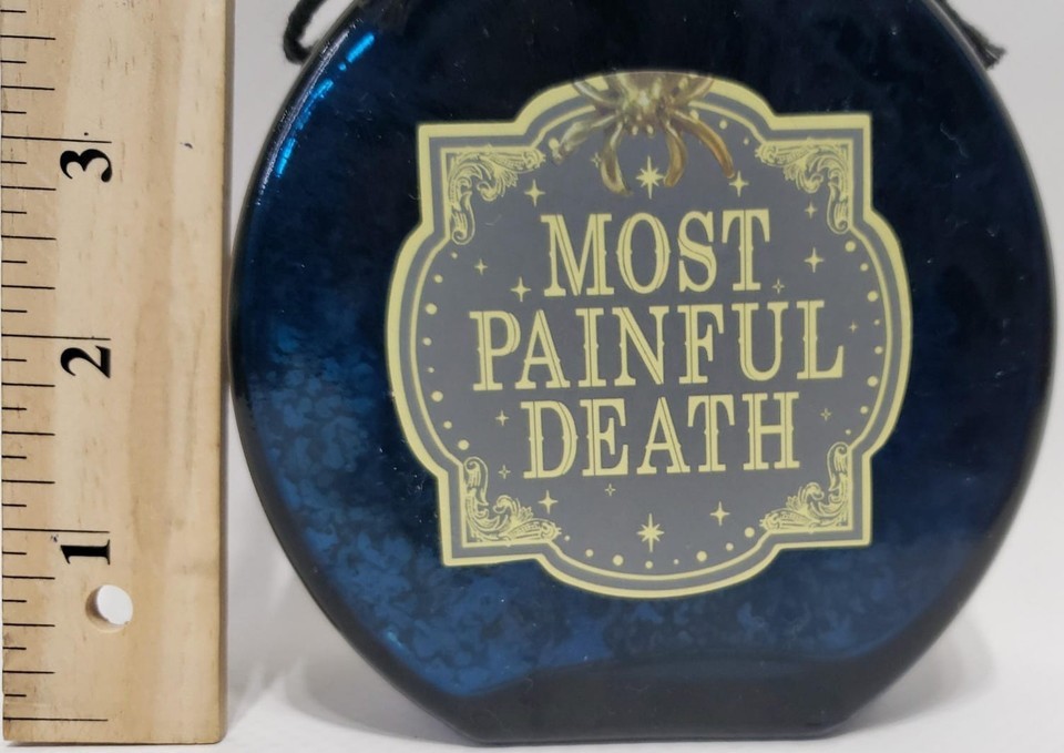 "MOST PAINFUL DEATH" Label: A prominent, antique-style label in a faded gold color against a dark grey background reads "MOST PAINFUL DEATH," surrounded by stars and ornate scrollwork. A spiderweb graphic is also visible.