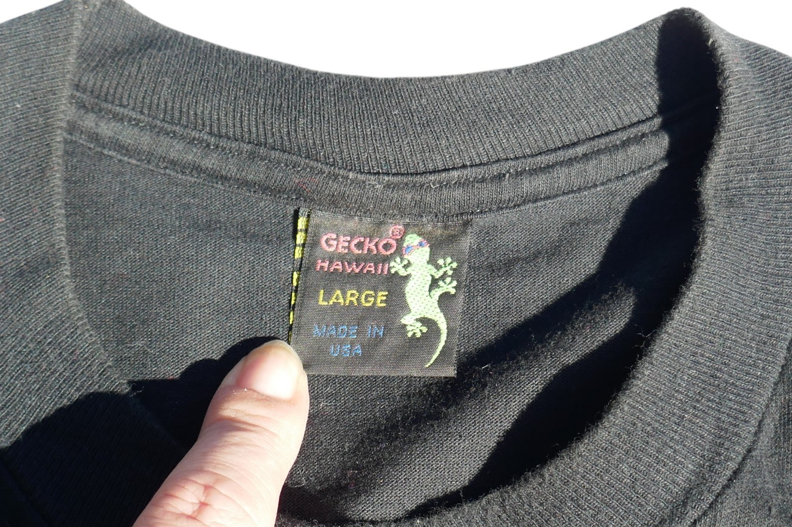 The Happy Shirts Gecko Hawaii Double Sided Vintage T-Shirt is a black cotton shirt with a graphic design perfect for those who love retro 1990s style. Made in the USA by Gecko Hawaii, this shirt has a regular fit with a chest size of 44 inches and a shoulder to hem measurement of 31 inches. The shirt is a unique and stylish addition to any wardrobe for fans of vintage graphic tees.
