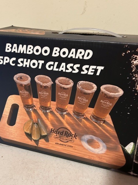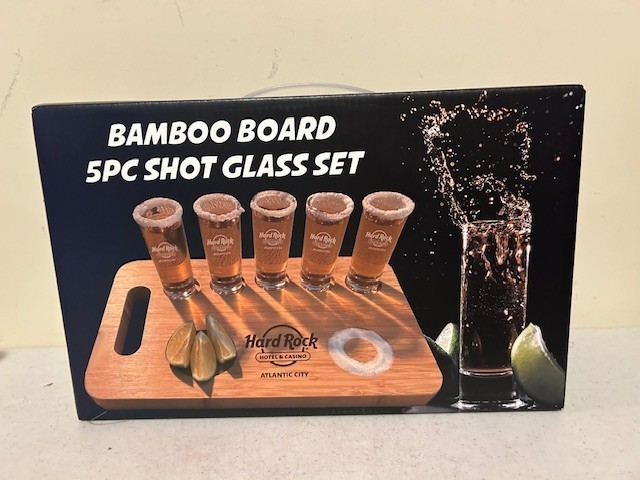 - Hard Rock Casino New 5 pc Shot Glass Set with Bamboo Board