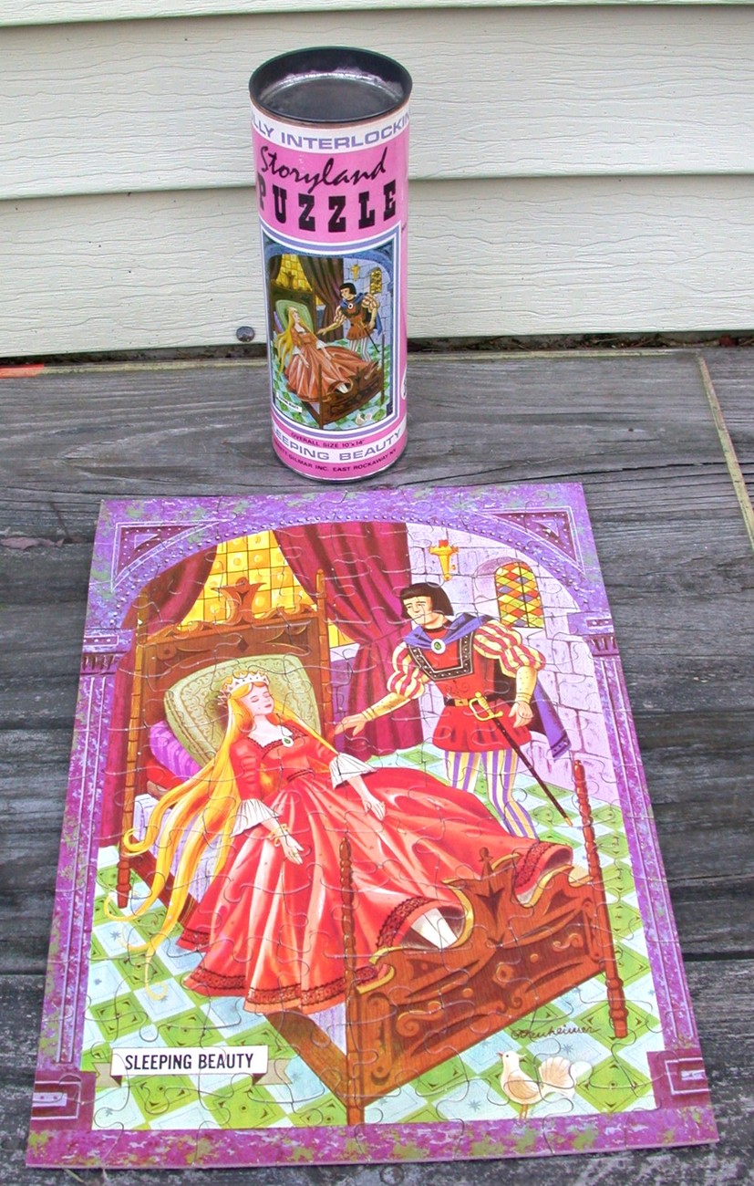Vintage Sleeping Beauty Storyland jigsaw puzzle No. 429-49 by Harett-Gilmar, Inc. of East Rockaway, NY. This rectangular puzzle is 10 x 14 inches and comes in a cylindrical can. All the pieces are there. Puzzle has a few bent pieces but is generally in good, clean used condition.