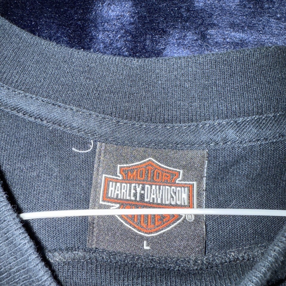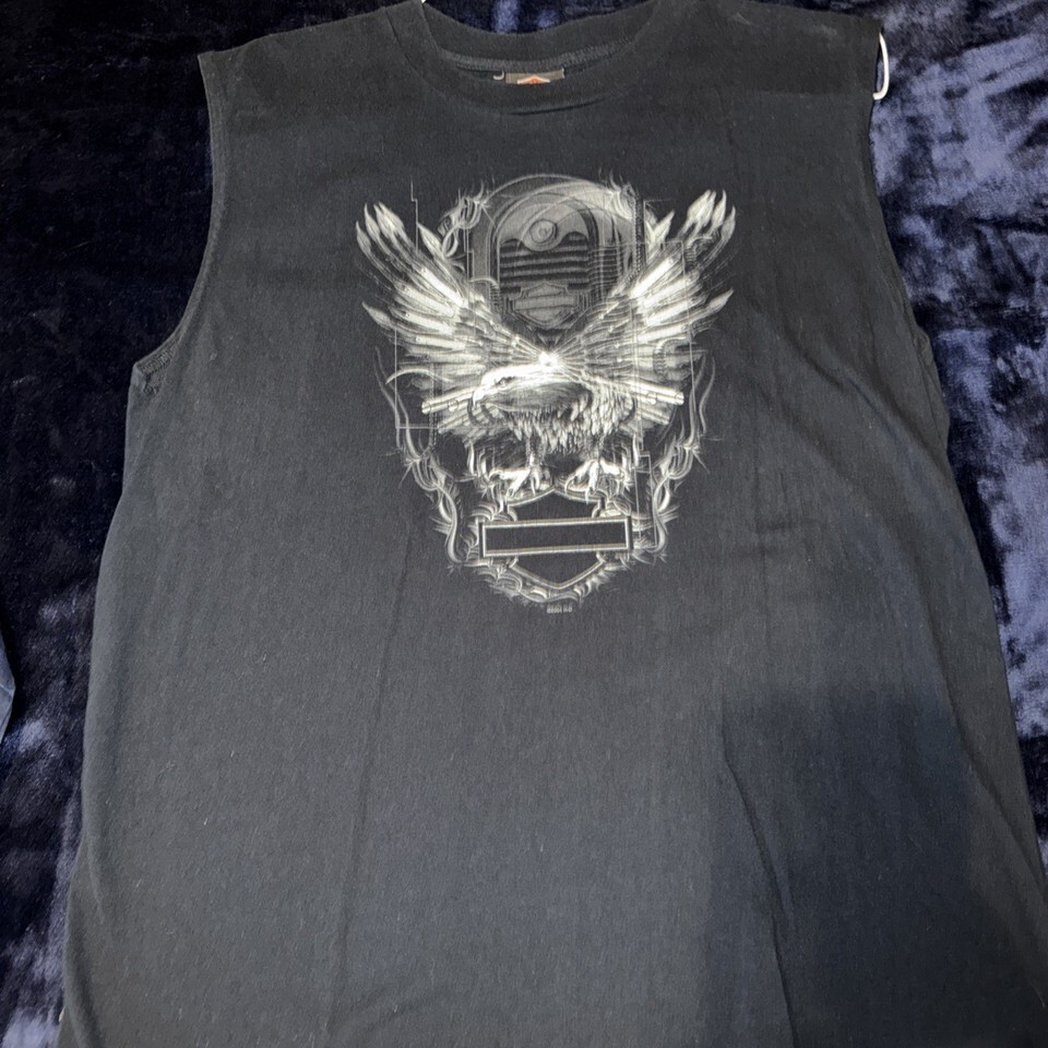 The product is a Harley Davidson Black Sleeveless T-Shirt featuring a pirate theme, designed for men in size L. It is a graphic print shirt with a biker and motorcycle rally theme, suitable for machine washing. The shirt is double-sided, making it a unique addition to any Harley-Davidson fan's wardrobe. Perfect for casual wear or showing off at a motorcycle event, this sleeveless t-shirt is a stylish and comfortable choice for those who appreciate the brand's iconic designs.